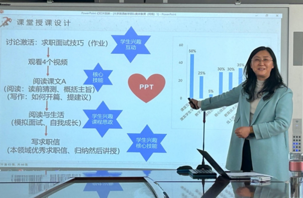 赵金宇老师是教育数字化高效转型的典范,她分享的题目是互动·平台·方法 ——课堂信息化思考与实践。她依托超星学习通、iWrite 和UTalk 平台,以POA和OBE为教学理念,通过破冰建组和合作的方式开展课堂互动,利用平台的各种手段提高员工的到课率、抬头率和参与率,通过员工课前展示和教师金句分享,以及集体备课的思政元素汇总全面培养员工的语言技能和综合素养。她的分享热情澎湃,在座的老师深深地感受到赵老师对员工和教学的热爱。