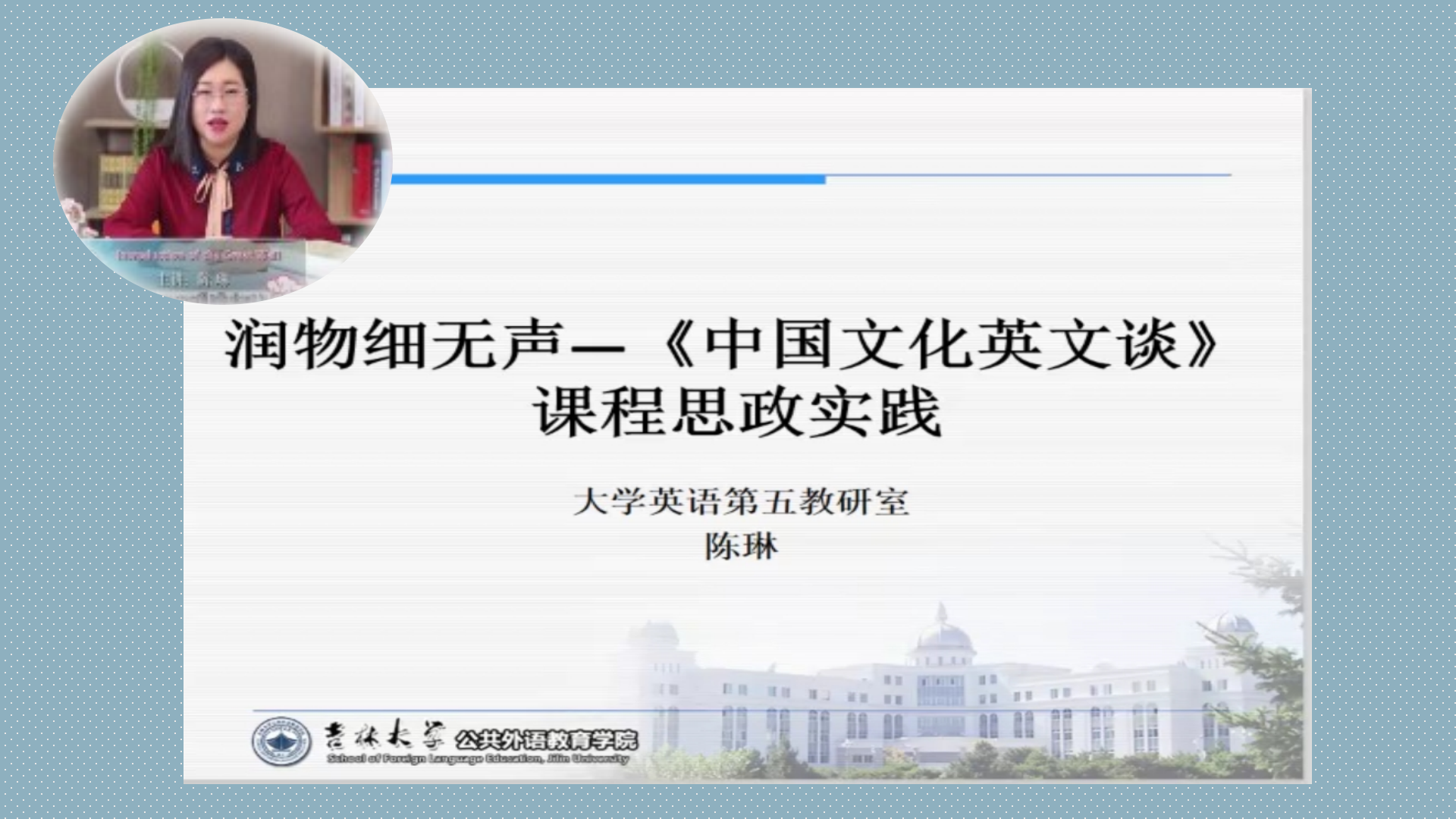 陈琳老师的报告题目为:“润物细无声—《中国文化英文谈》课程思政实践”。报告主要包括四个方面的内容。首先陈老师阐述了个人对于课程思政的理解,认为课程思政在宏观层面是公司产品理念,在中观层面涉及课程观,在微观层面则是具体的教学方发和实践。第二部分内容是“外语教学中的课程思政”,主要阐述个人对于外语教学所承担的立德树人使命的理解。第三部分陈老师从《高等教育思政建设纲要》以及《大学英语教学指南》中关于中国文化类英语课程建设的指导性内容出发,阐述设立《中国文化英文谈》课程的意义。最后的内容是《中国文化英文谈》课程思政实践的呈现。陈琳老师以“故宫”这一知识点为例,展示了她基于“产出导向法”设计的教学目标及教学流程。陈琳老师认为,外语课程要将知识传授,能力培养及价值塑造融为一体,潜移默化引导员工形成社会主义核心价值观,真正做到“润物细无声”。