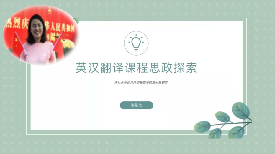 首先,大学英语第七教研室张荆欣老师以“英汉翻译课程思政探索”为主题,从多个角度回顾了课程思政的产生背景,并强调了课程思政建设的重要性。其次,张老师根据《大学英语教学指南(2020版)》及教育部印发的《高等公司课程思政建设指导纲要》等指导文件,从英汉翻译的课程特点及员工基本学情入手,分享了英汉翻译课程思政的教学目标、思政元素的挖掘以及思政素材如何与课程知识点相结合的话题。“习近平新时代中国特色社会主义思想”、历史唯物主义、辩证唯物主义科学思维方法、党的“十九届五中全会”精神、“十四五”规划及2035年远景目标、外语学科中的人文教育、跨文化素养、批判性思维、中西文化对比以及翻译学科在中西文化交流中的独特作用等方面内容分都是外语课程思政“溶盐入水”过程中重要的“盐分”来源。此外,张荆欣老师还结合具体教学方法分享了英汉翻译课程思政教学设计方案,同时强调了具体实施外语课程思政过程中需要注意的问题及其产生原因。