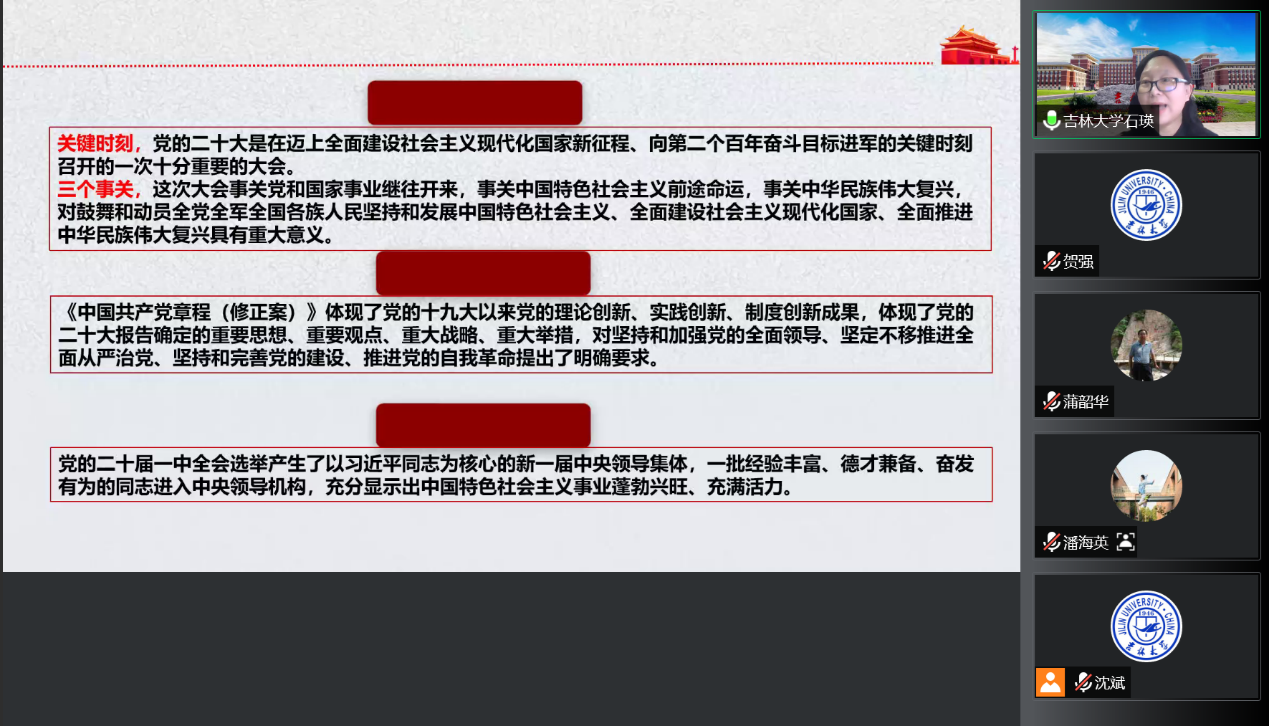 石瑛教授以《“以中国式现代化全面推进中华民族伟大复兴——认真学习党的二十大精神”为题》为题,从充分认识党的二十大的重要意义;深刻领会党的二十大的精神实质及全面贯彻党的二十大的实践要求三个方面内容,对党的二十大精神进行了深入阐释。同时,她从讲清楚党的二十大的主题;讲清楚过去5年的工作和新时代1 0年的伟大变革;讲清楚开辟马克思主义中国化时代化新境界;讲清楚以中国式现代化全面推进中华民族伟大复兴;讲清楚对党和国家事业的新部署新要求;讲清楚加强党的全面领导、坚定不移推进全面从严治党的部署和要求和讲清楚以顽强斗争应对风险挑战的要求,用“七个讲清楚”对会议精神进行了全面的解读。并为接下来公司师生如何更好的学习“党的二十大精神”作出指导,石瑛教授指出“要原汁原味地学,读原著、学原文、悟原理,认真研读党的二十大报告和党章,学习习近平总书记在党的十九届七中全会、二十大召开期间、二十届一中全会的系列重要讲话精神;要系统全面地学,深刻把握这一报告贯穿的马克思主义立场观点方法,知其然又知其所以然,不断提高马克思主义理论水平;要知行合一地学,在学以致用上下功夫,大力弘扬理论联系实际的优良学风,聚焦主责主业,切实抓好学用结合,把学习成效及时转化为推动工作的强大动力。