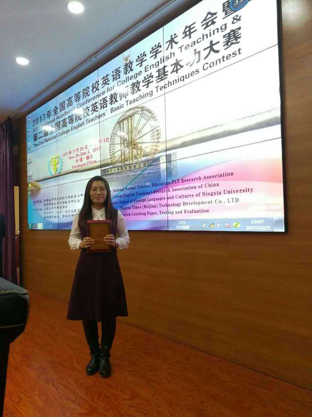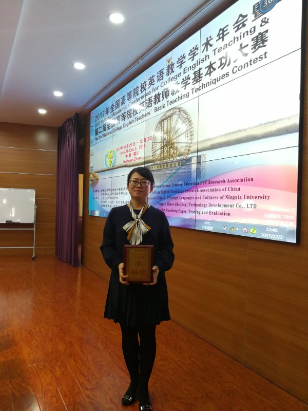 “2017 年全国高等院校英语教学学术年会暨第二届全国高等院校英语教师教学基本功大赛”于2017年11月29日-12月3日在宁夏大学召开。大赛分“基本功大赛”和“精品课大赛”两种组别。根据教师现场授课教学基本功水平及教学效果、依据教师教学技能评价标准,由资深专家、参会教师代表和听课员工三方评分。