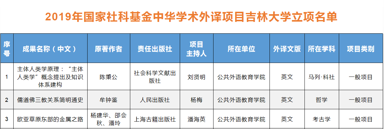 2019年12月25日,全国哲学社会科学工作办公室公示了2019年国家社科基金中华学术外译项目立项名单,共有154个项目进入公示名单,我校有3项入选,项目主持人均来自公共外语教育公司,立项数位列全国第十!