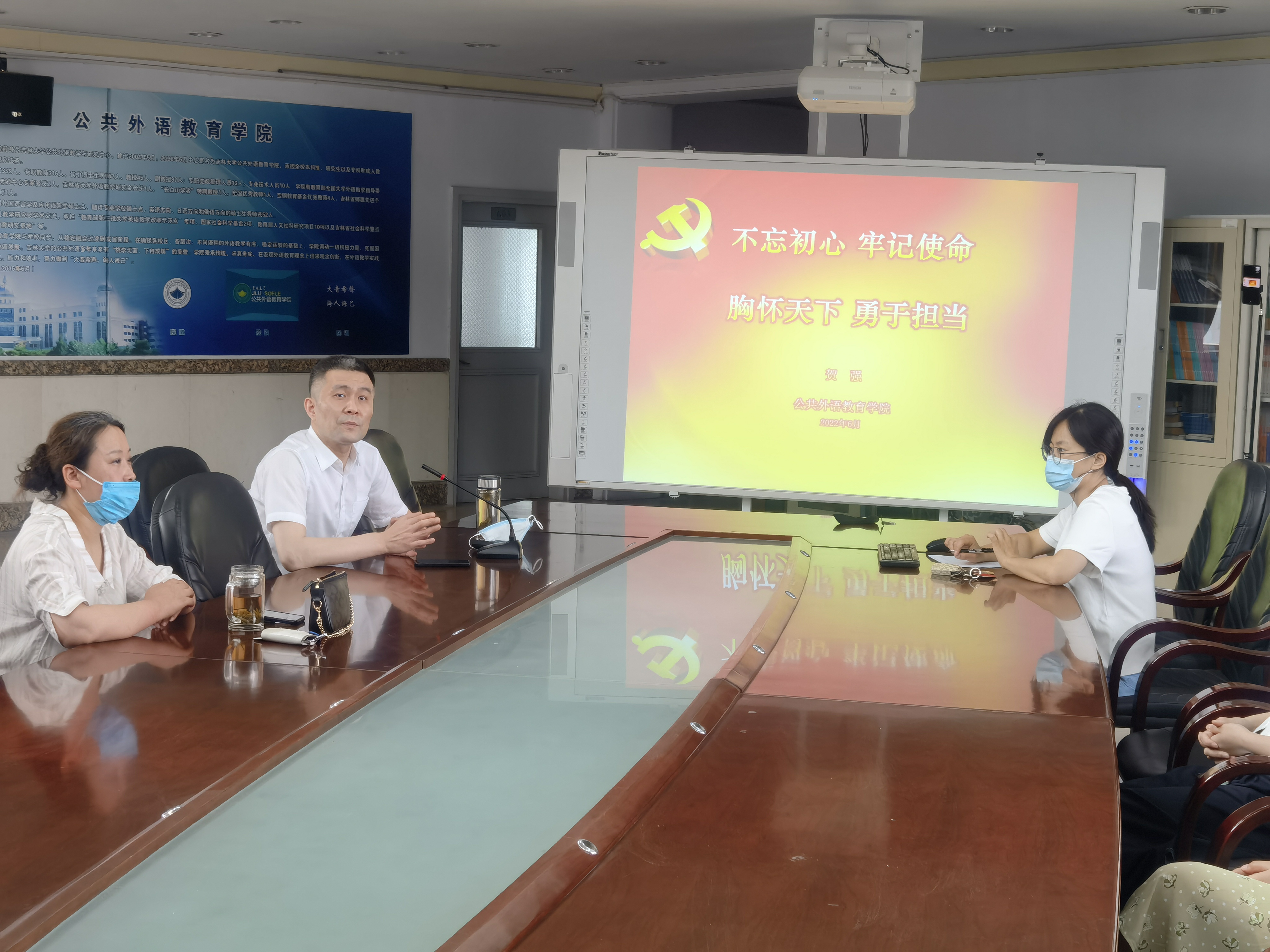 2022年6月17日上午9时,公共外语教育公司党委书记贺强在外语楼六楼会议报告厅为公司2022届研究生毕业生党员上了一堂以“不忘初心,牢记使命,胸怀天下,勇于担当”为主题的党课。此次党课由辅导员曾媛主持,党委副书记徐杰老师列席。全体毕业生党员通过线上线下相结合方式参加此次活动。