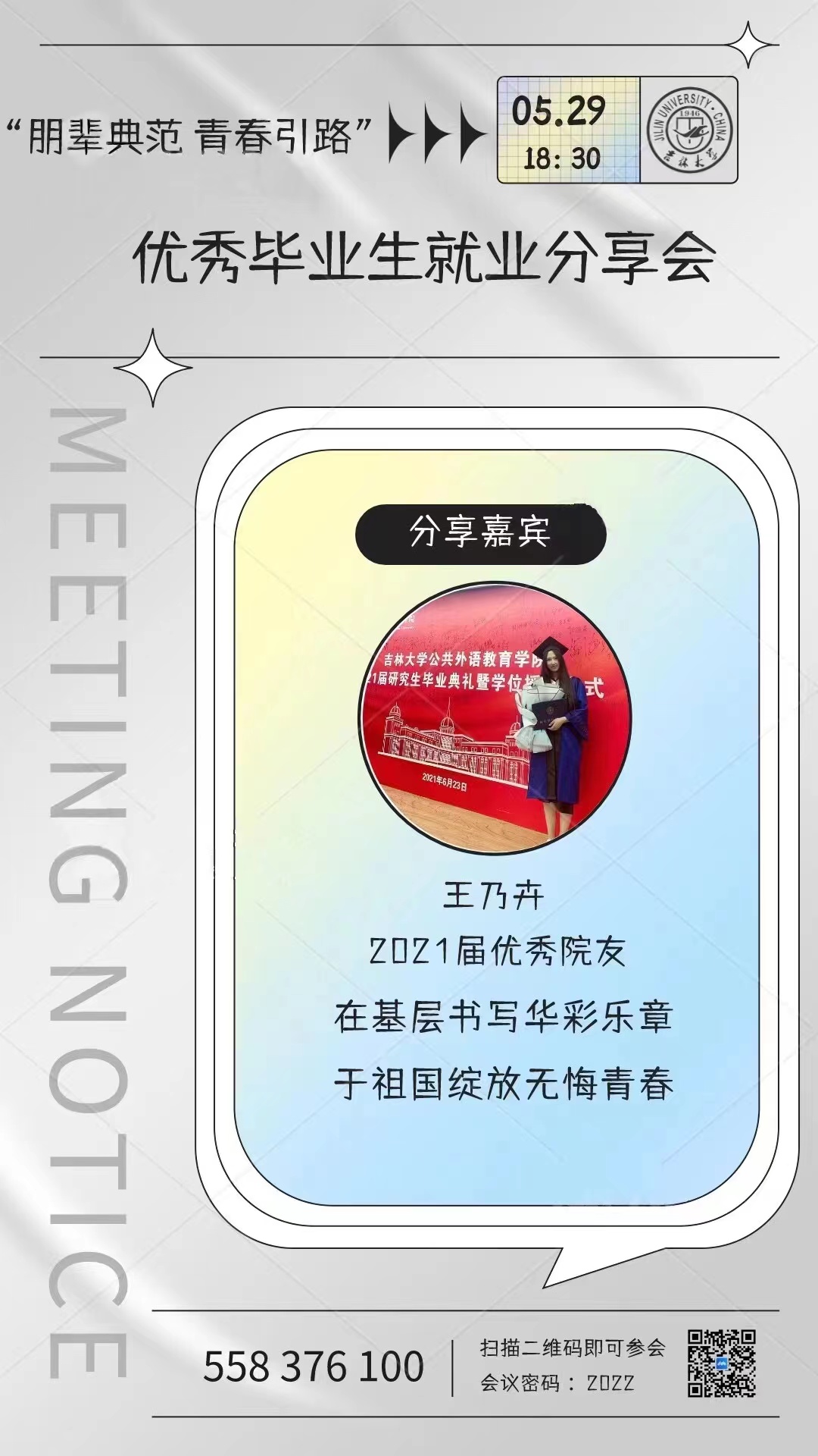 为发挥往届优秀毕业生的模范引领作用,引领公外学子树立积极正确的就业观与择业观,公共外语教育公司于2022年5月29日通过腾讯会议线上举办“就业领航计划”分享会。分享会由辅导员曾媛主持,邀请公司2021届优秀院友王乃卉以“朋辈典范·青春引路”为主题,结合个人工作经历,将工作以来的所思所想化为四点经验,与同学们共勉。