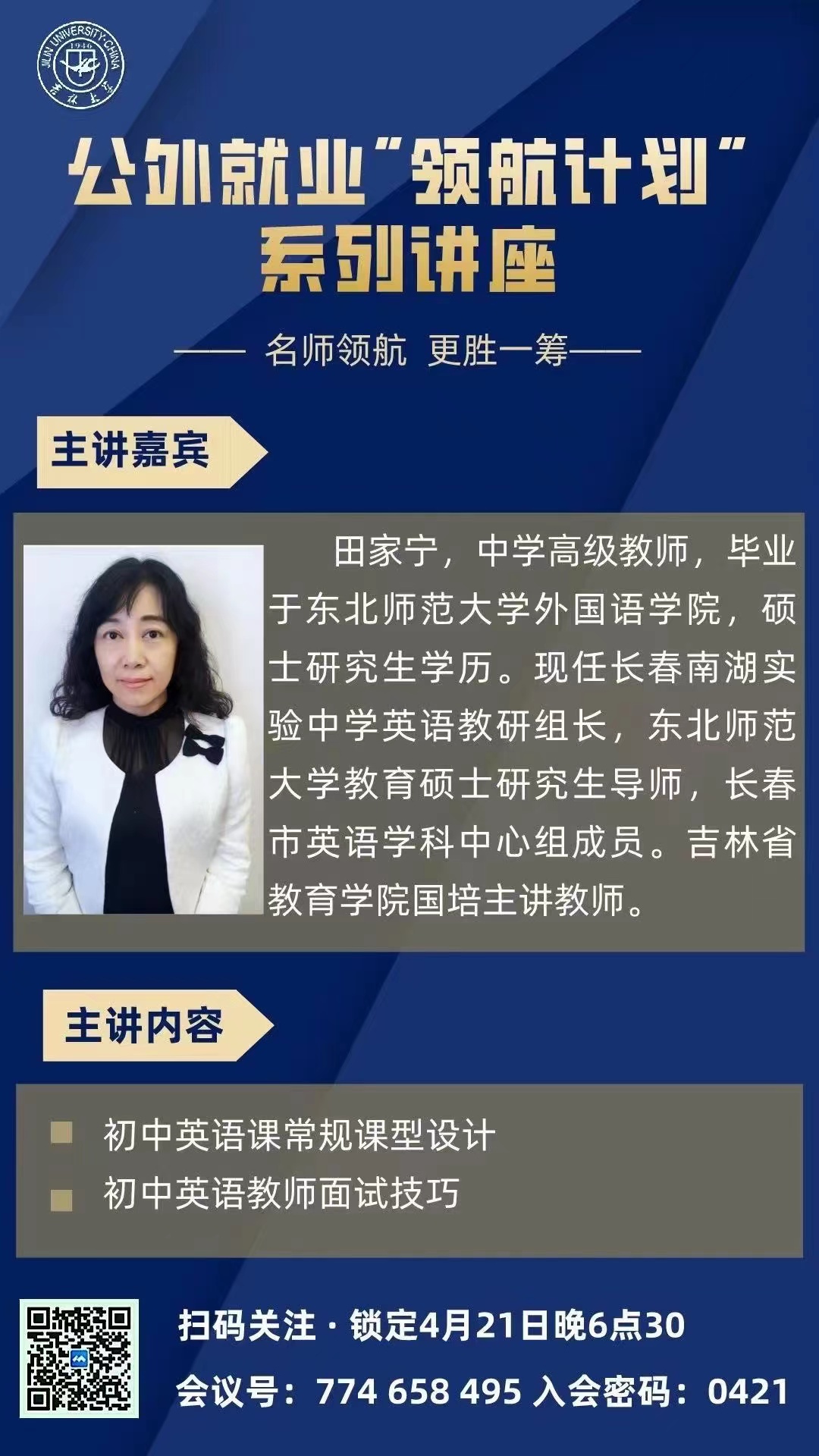 本次分享会特邀长春市英语教学名师——田家宁老师,结合自己二十年多年来的教学经验为同学们进行了职业分享。会议由公司研究生辅导员曾媛主持,校内外200余名同学参会并进行深度交流,反响十分热烈。