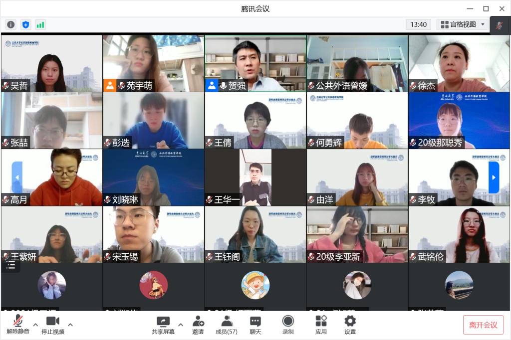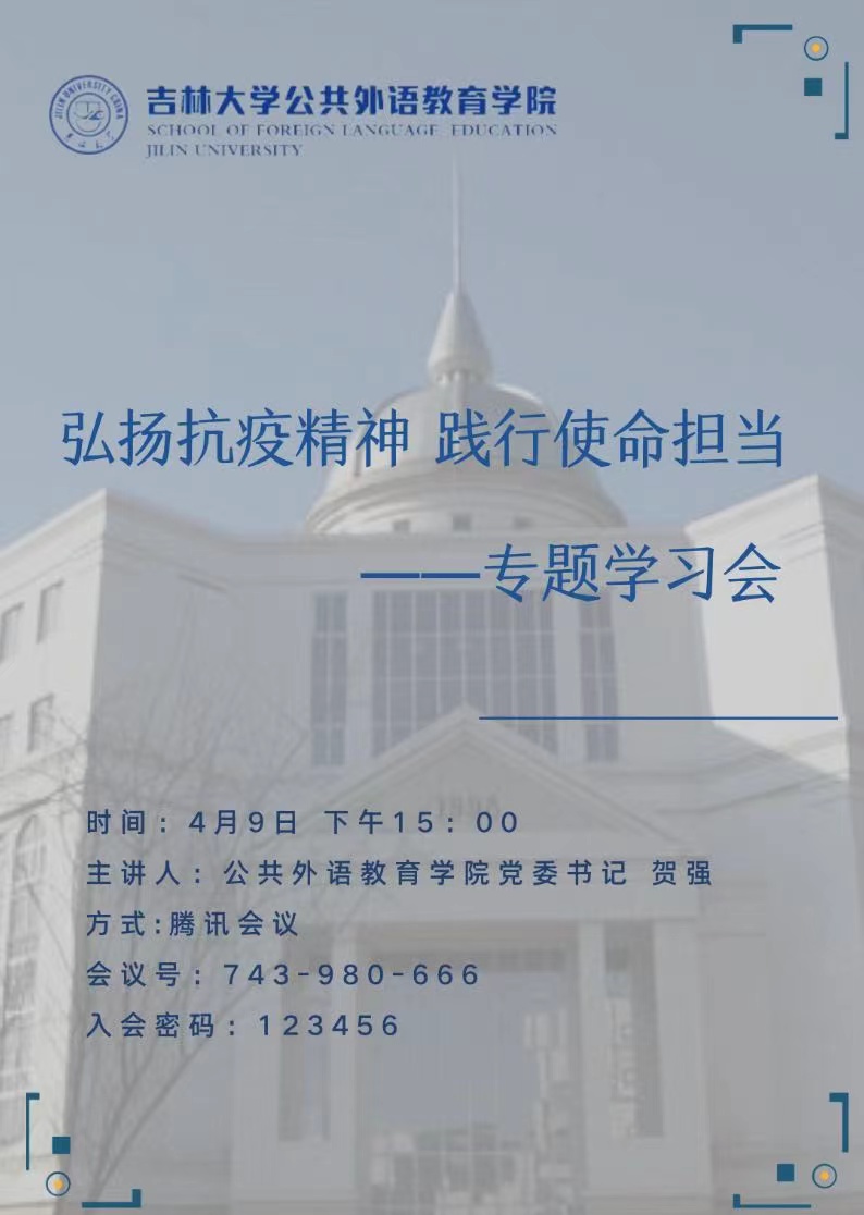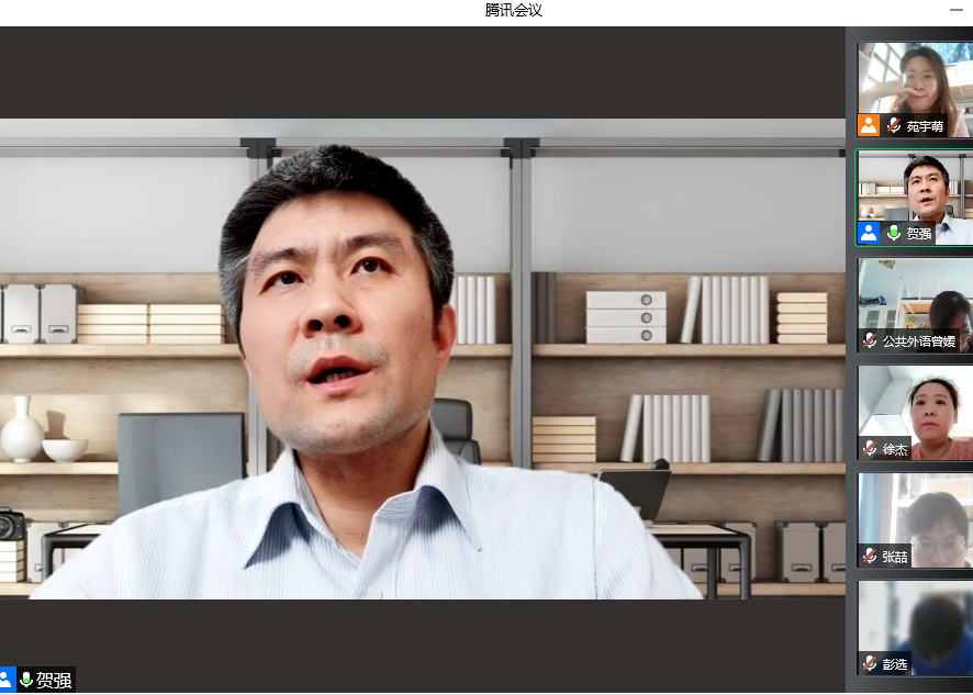 为进一步宣传校园疫情防控政策,有效防范化解风险,构筑校园疫情防控坚固防线,决战决胜抗疫“冲刺期”,公共外语教育公司党委书记贺强于4月9日下午15:00通过腾讯会议为同学们讲授了一堂以“弘扬抗疫精神,践行使命担当”为主题的学习会。会议由研究生辅导员曾媛老师主持,公司党委副书记徐杰列席会议并做总结发言,公司全体员工干部、防疫志愿者和寝室长参会。