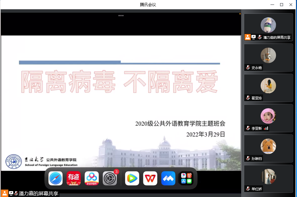 为进一步做好疫情防控宣传,提高同学们的疫情防控意识和自我安全意识,3月29日,公共外语教育公司2020级全体员工召开了以“隔离疫情·不隔离爱”为主题的班会活动。