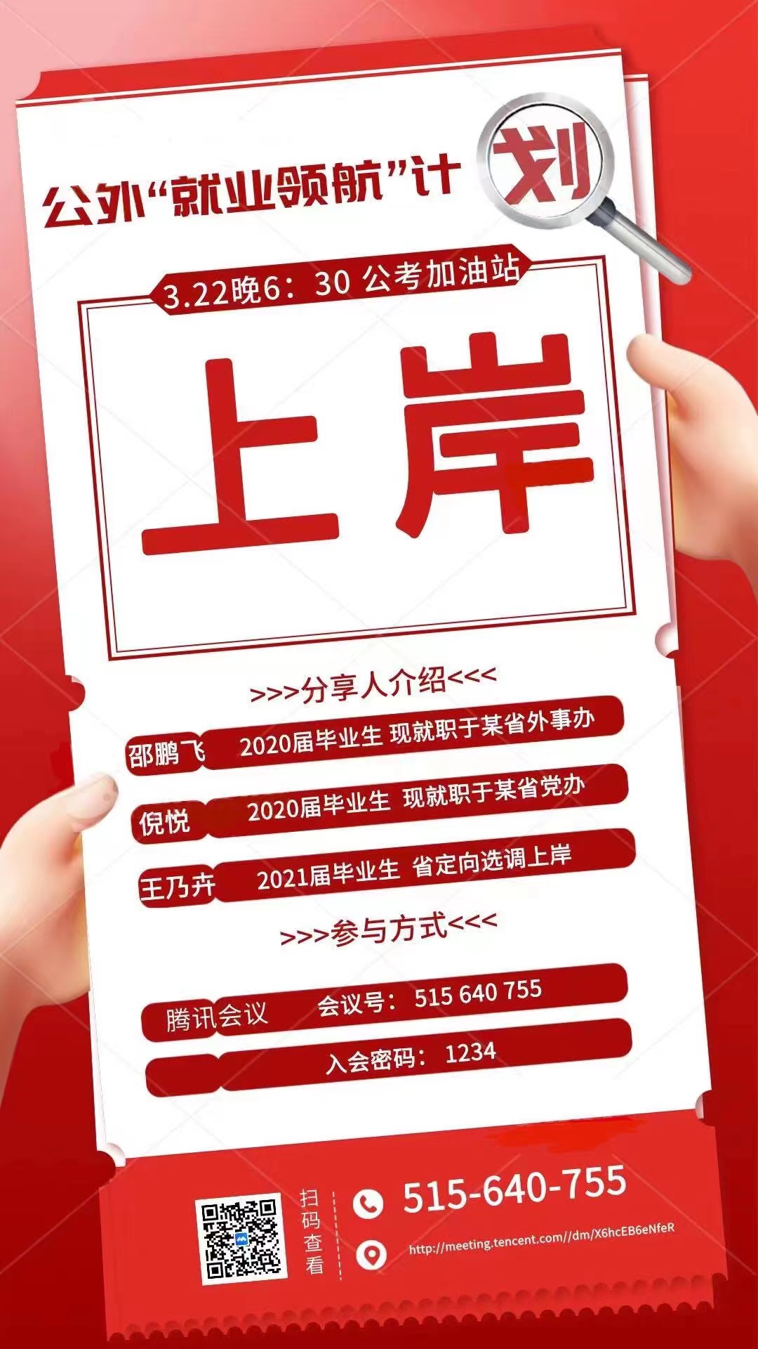 为进一步开展就业指导工作,全力推进公司同学高质量就业,公共外语教育公司于2022年03月22日通过腾讯会议线上举办“就业领航”计划——公务员方向专场分享会,帮助同学们了解公务员和选调生,提前做好职业规划。本次分享会邀请了已成功考取公务员和选调生的2020届、2021届毕业生代表,围绕个人备考的心路历程与经验总结展开分享。会议由公司研究生辅导员曾媛主持,2020级和2021级百余名同学参会,进行了广泛交流,气氛热烈。