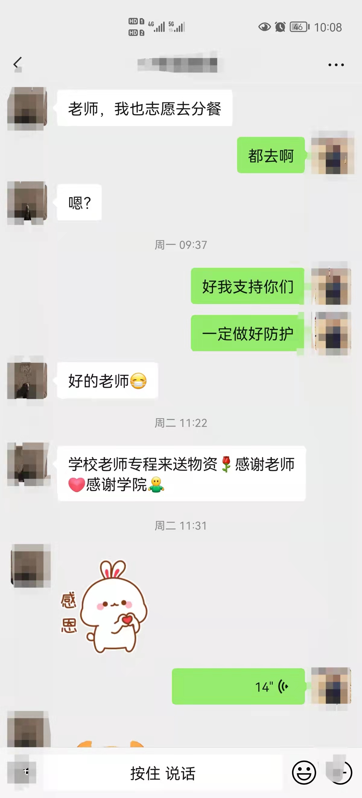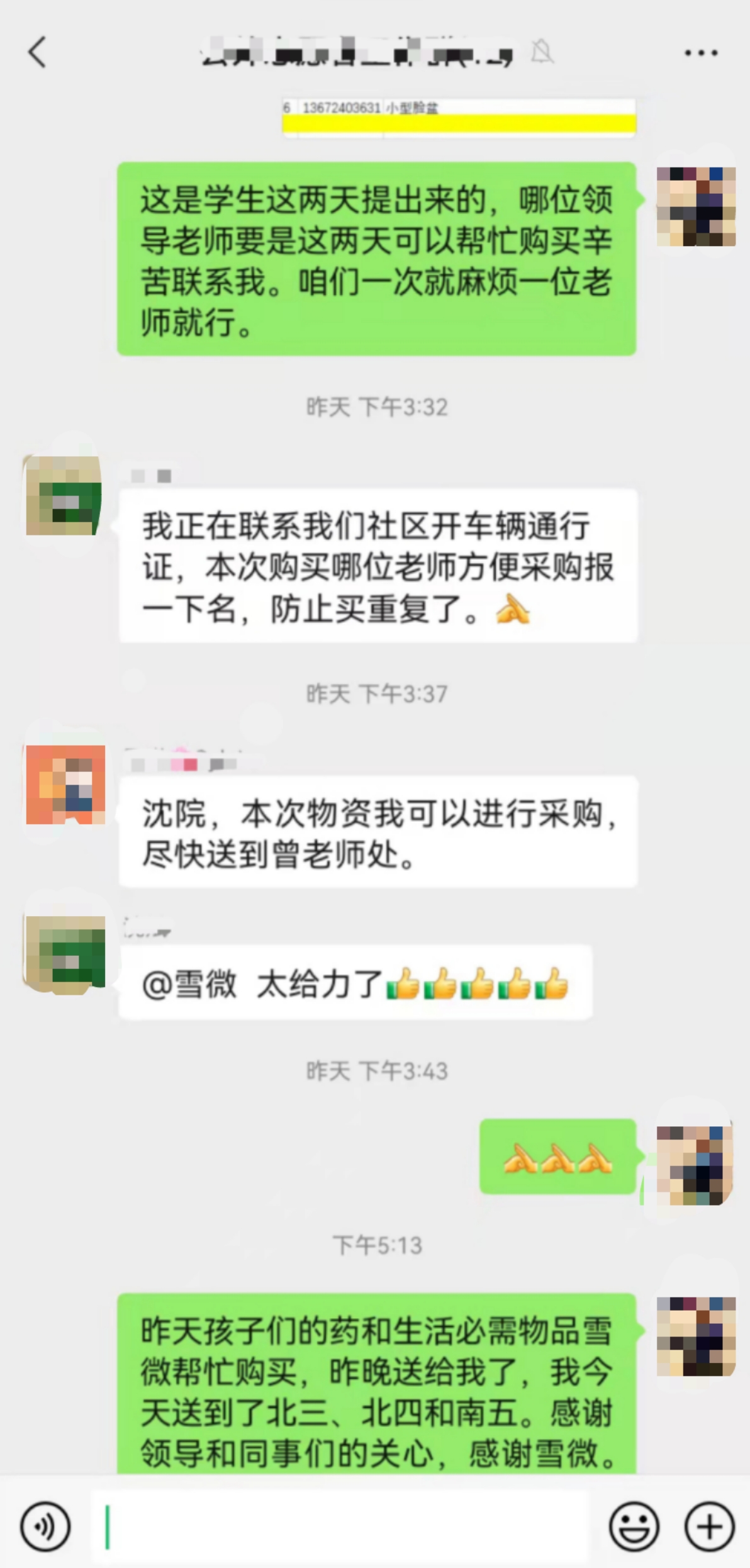 “孩子们安心,我跟你们在一起”,“我把家里和公司存的防疫物资给同学们送过去,大家在宿舍安心学习生活”,“大家开展志愿服务的同时,一定要注重个人防护”……公司辅导员曾媛老师不畏风险,坚持进校园陪同学们共渡难关。她深入了解员工状况,安抚员工情绪,将家中的物资倾囊相送。