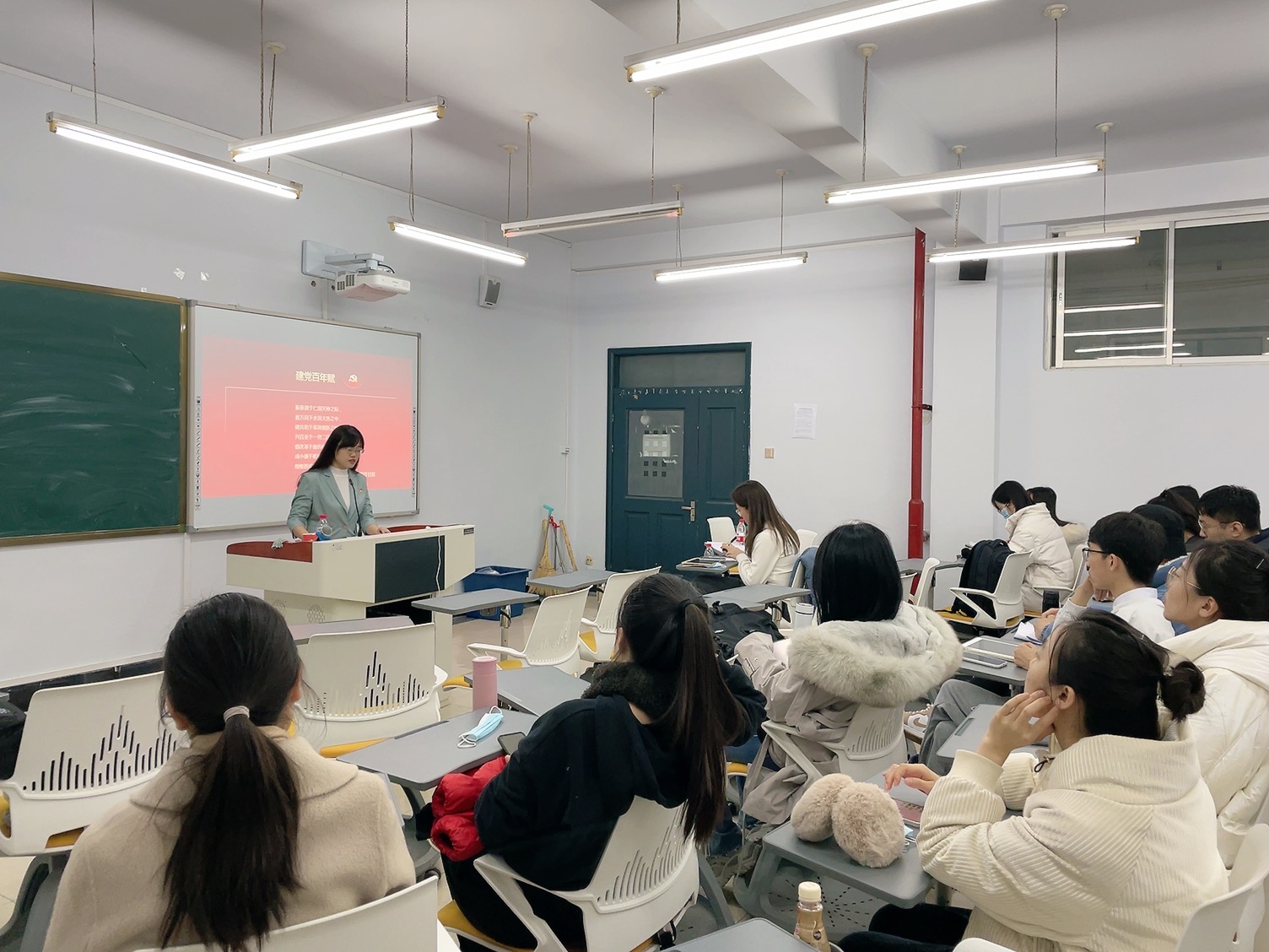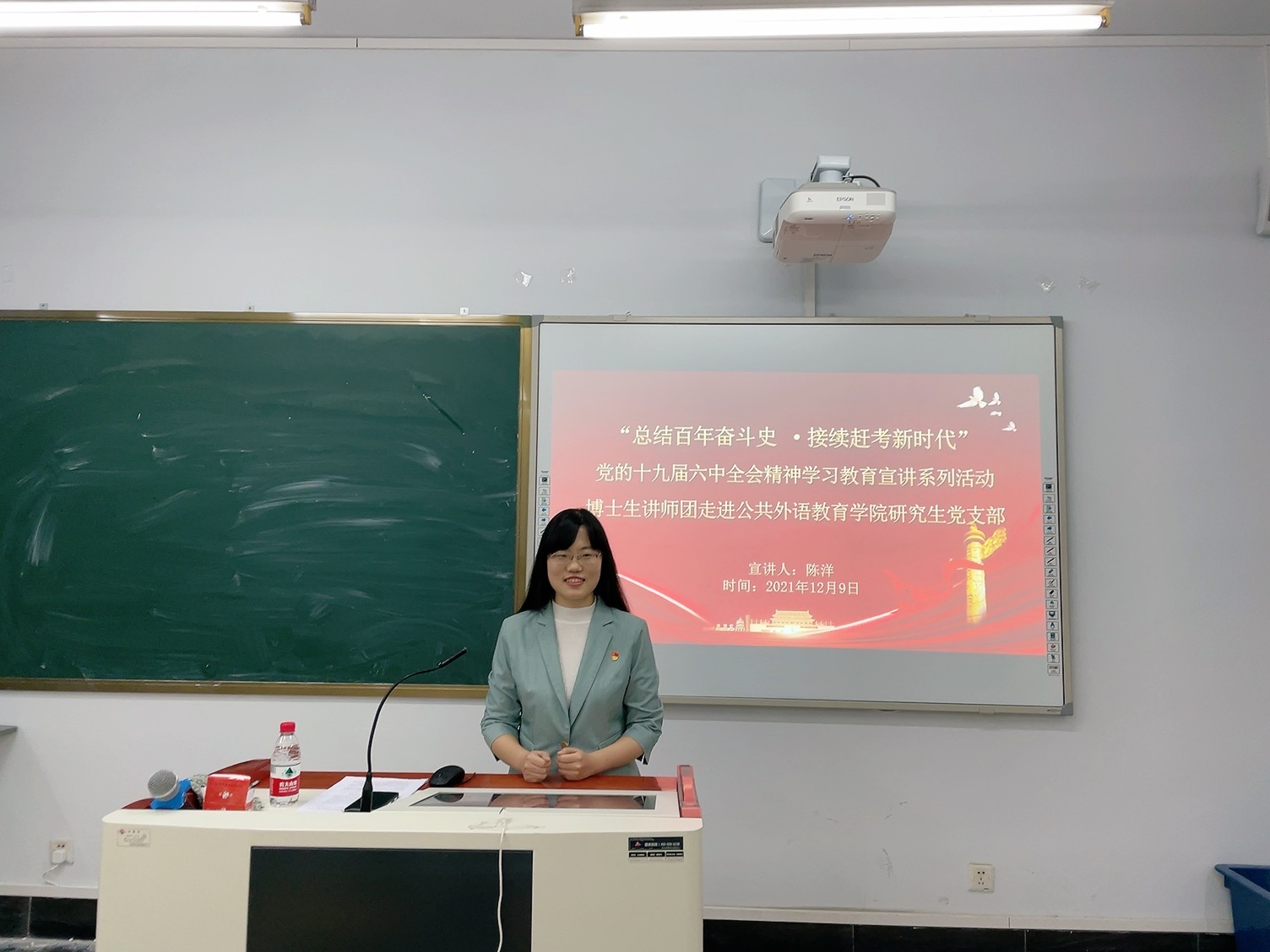 陈洋从四个方面对我党百年奋斗史逐一进行讲解:中国共产党的百年奋斗和伟大成就、中国共产党的百年奋斗经验、从党的百年历程中汲取抗疫精神和中国共产党百年奋斗再起新征程。陈洋向同学们介绍了十九届六中全会的情况和内容,指出十九届六中全会的着力点在于总结党的百年奋斗成就和历史经验,并审议通过了召开党的第二十次全国代表大会的决议。接着陈洋博士细致讲解了党伟大奋斗精神财富——“十个坚持”,指出回顾历史,才能总结历史经验、把握历史规律,增强开拓前进的勇气和力量。最后,她将如今遍布全球的疫情与中国赶考相结合,从党的百年历程中汲取抗疫精神力量。2019年末新冠病毒突然袭来,我党组织开展全方位防控工作,疫情防控取得了显著成效,这是因为中国始终坚持党中央坚强的领导,面对防控新冠病毒的战斗,上下齐心协力,快速响应,积极动员群众、组织群众、凝聚群众,构筑起群防群治的严密防线,形成了团结一心的强大合力,汇聚起疫情防控的硬核力量。