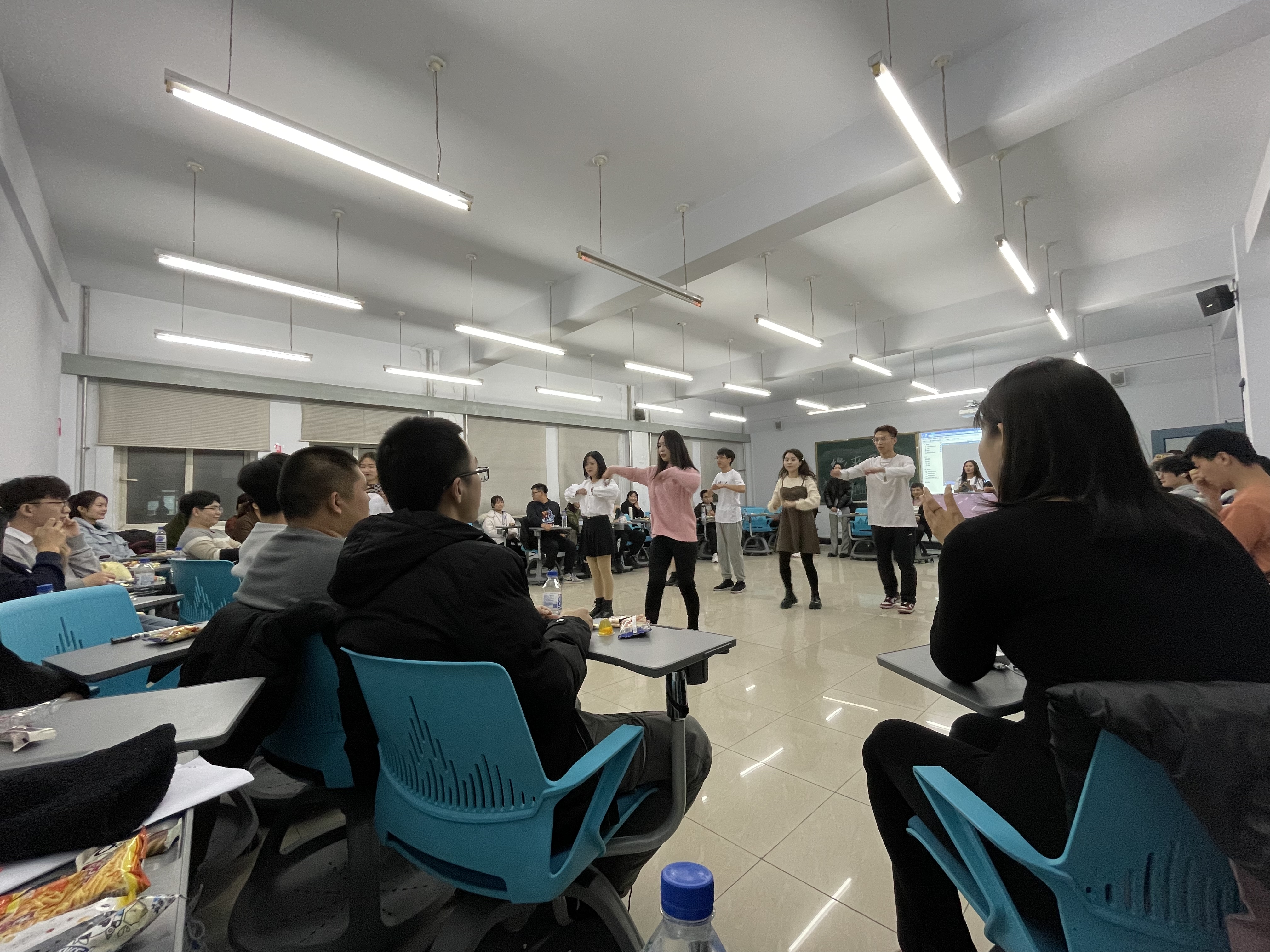 联谊开始,主持人分别介绍了两院的基本情况和联谊活动流程,并组织同学们进行自我介绍,增进了彼此了解。在游戏环节中,抓鸭子、传话筒和击鼓传花等各种游戏形式多样,色彩纷呈,同学们不仅乐在其中,更是在一片欢声笑语中拉近了彼此之间的距离,现场气氛十分活跃。才艺表演环节,化学公司彭鑫同学演唱《莫斯科郊外的晚上》、公共外语教育公司彭选同学演唱《忽然之间》、由洋和单春艳同学表演《Look what you make me do》和团体舞蹈《告白气球》,赢得了大家的赞许与掌声,将整场活动氛围推向高潮。