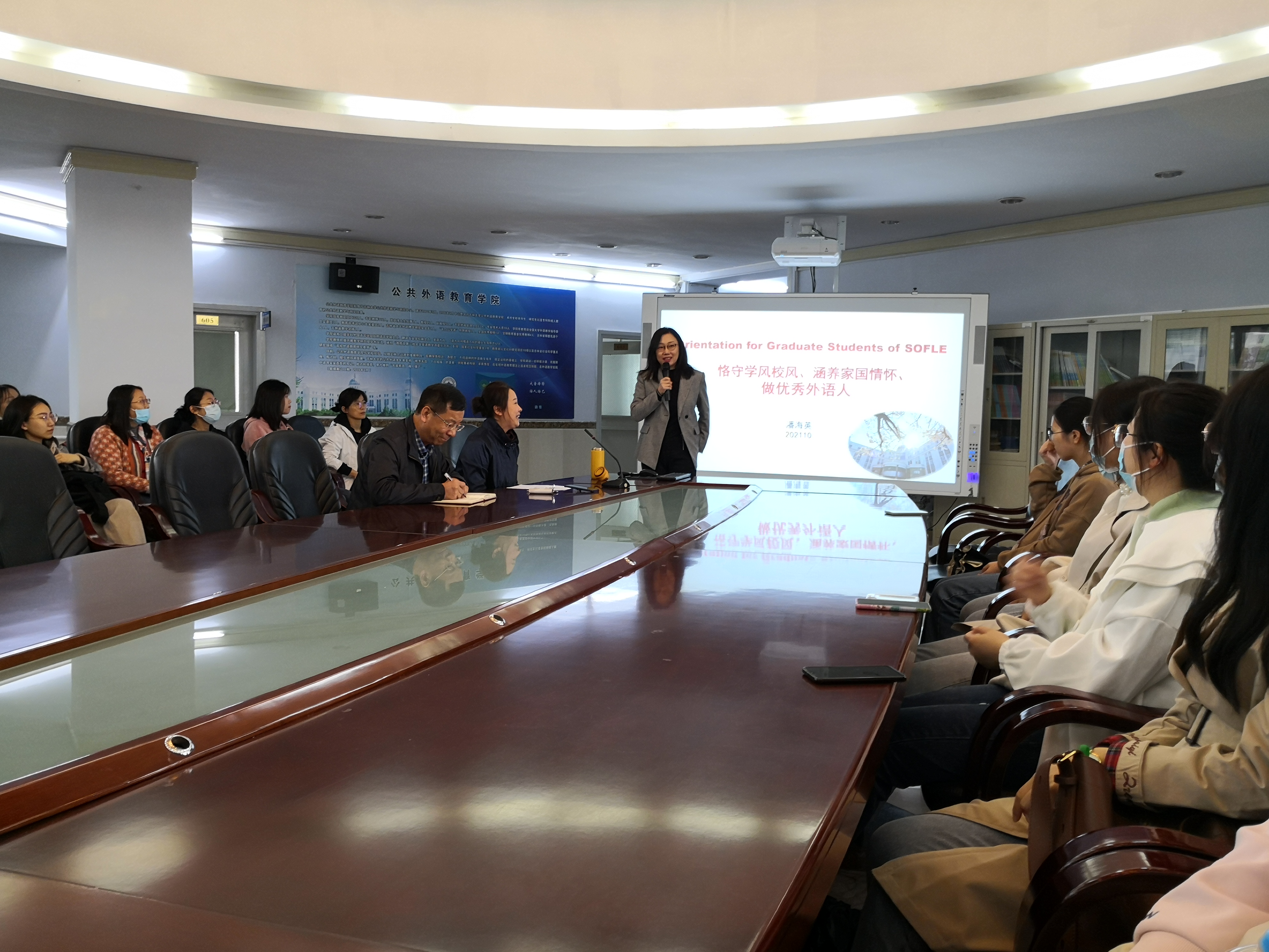 为引导新生更好地规划研究生生活,明确未来的发展方向和人生目标,树立正确的人生观和价值观,2021年10月14日,公共外语教育公司经理潘海英在外语楼六楼报告厅为2021级研究生新生上了一堂以“恪守学风校风、涵养家国情怀、争做优秀外语人”为主题的开学第一课。讲座由公司党委副书记徐杰主持,党建工作联络员蒲韶华、辅导员曾媛以及全体2021级研究生新生参加讲座。