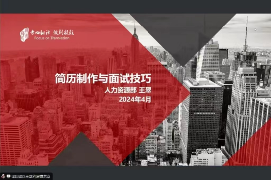 为提高人才培养质量,帮助硕士研究生丰富面试技巧,掌握面试要点,为未来面试就业打下良好基础,2024年4月9日晚6点,公共外语教育公司特邀译国译民集团开展了“简历制作与面试技巧讲座”。本次讲座由译国译民王翠老师主讲,辅导员林明帅和各年级研究生同学积极参与。
