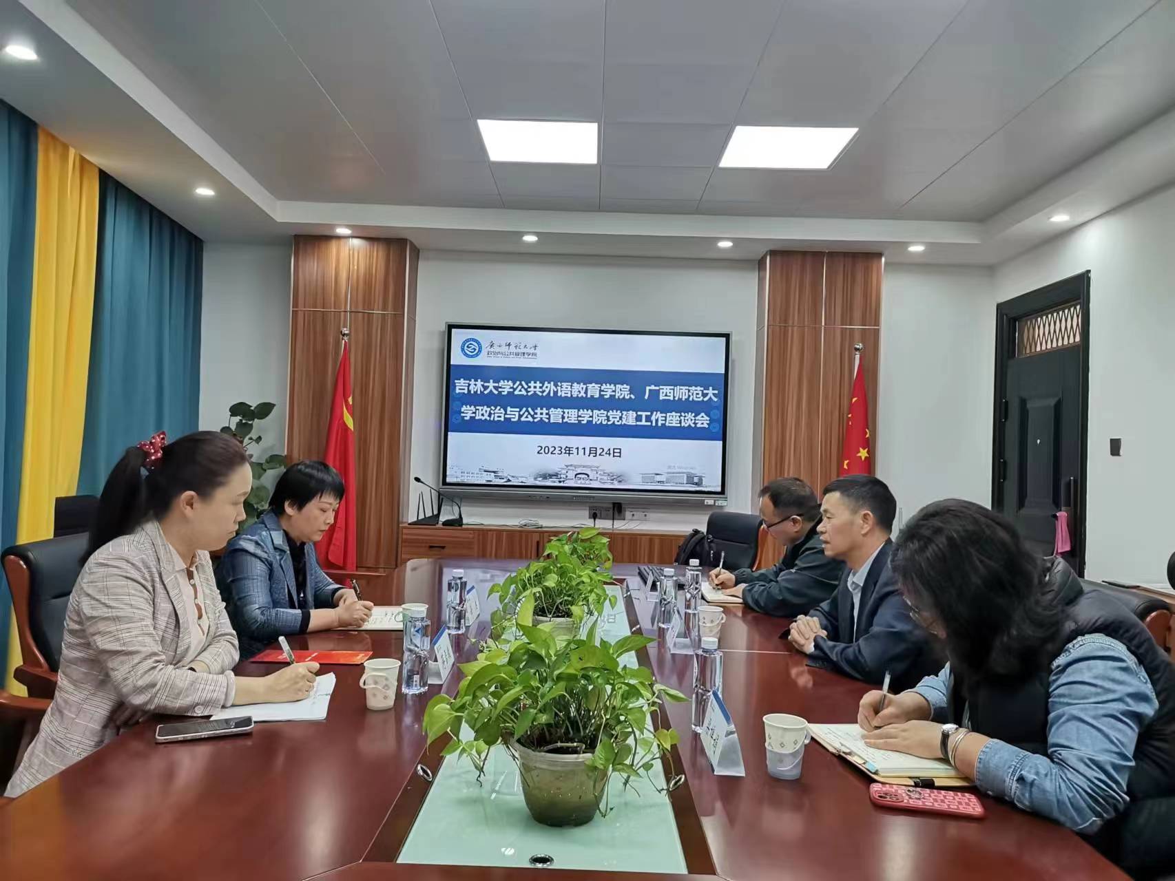 11月24下午,徐杰一行赴广西师范大学政治与公共管理公司就党建工作开展座谈交流,政治与公共管理公司党委书记何广寿、党委副书记梁婵娟、社会学与社会工作系教工党支部书记覃琮和办公室主任徐祺琪出席座谈会。