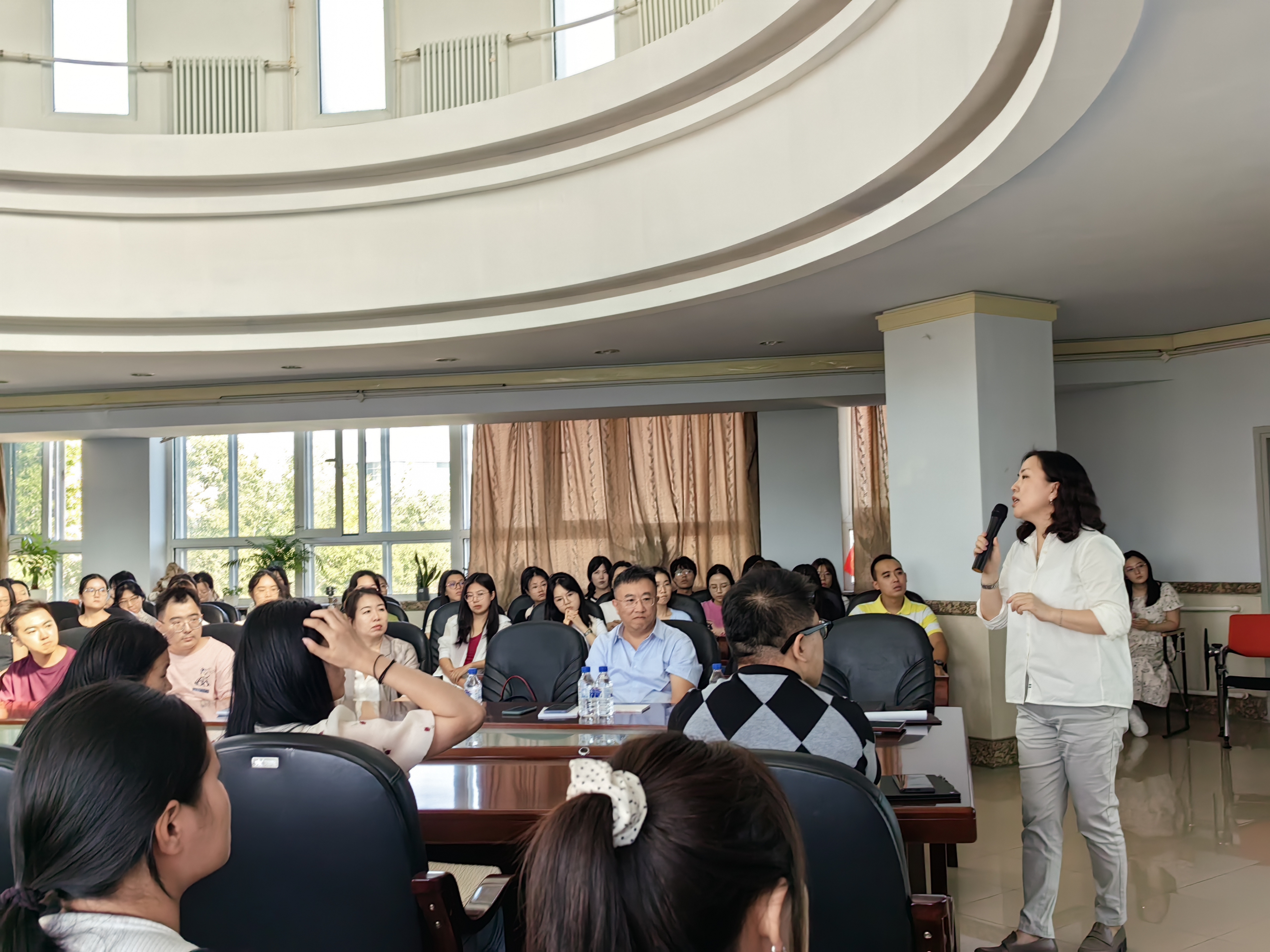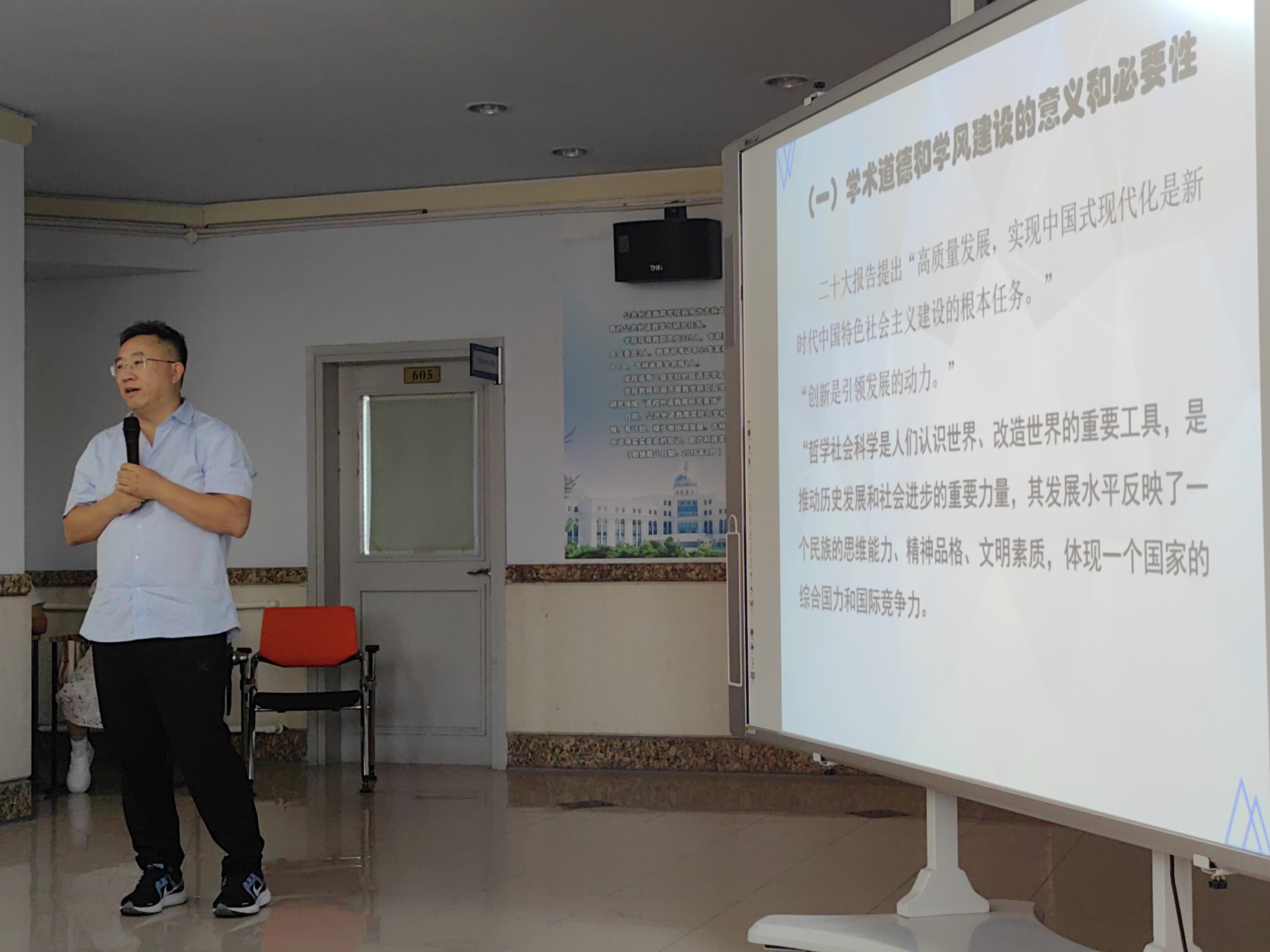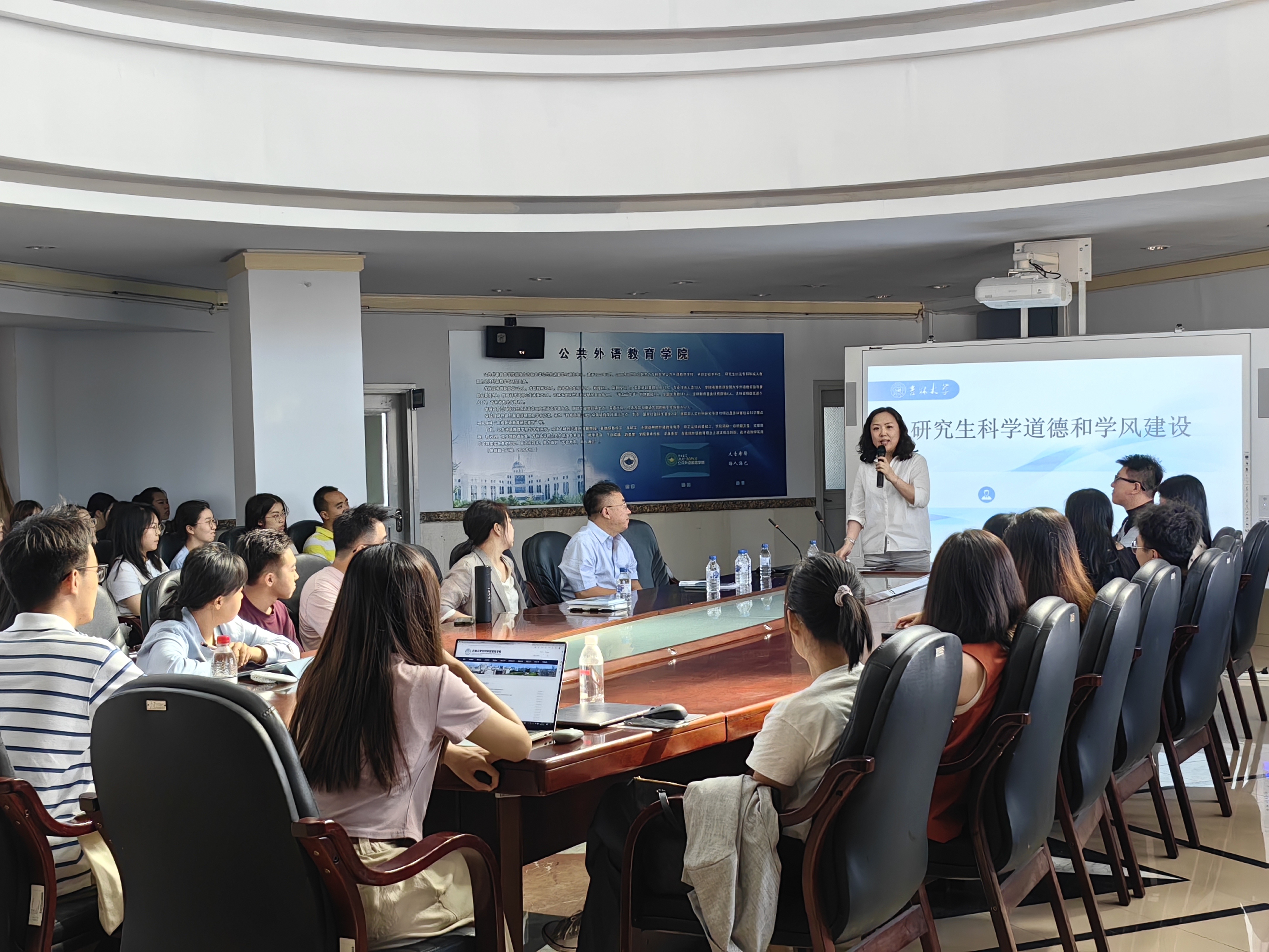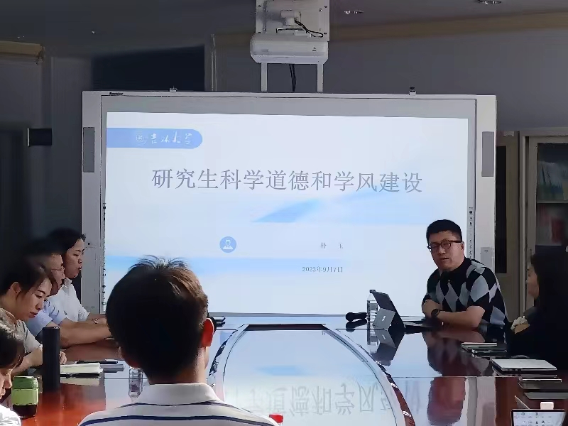 2023年9月7日下午,公共外语教育公司在外语楼6楼开展以“研究生科学道德和学风建设”为主题的讲座。讲座由公司副经理姜峰教授主持,朴玉教授、绪可望教授主讲,研究生办公室主任李萌、研究生辅导员林明帅及2023级全体研究生新生参加讲座。