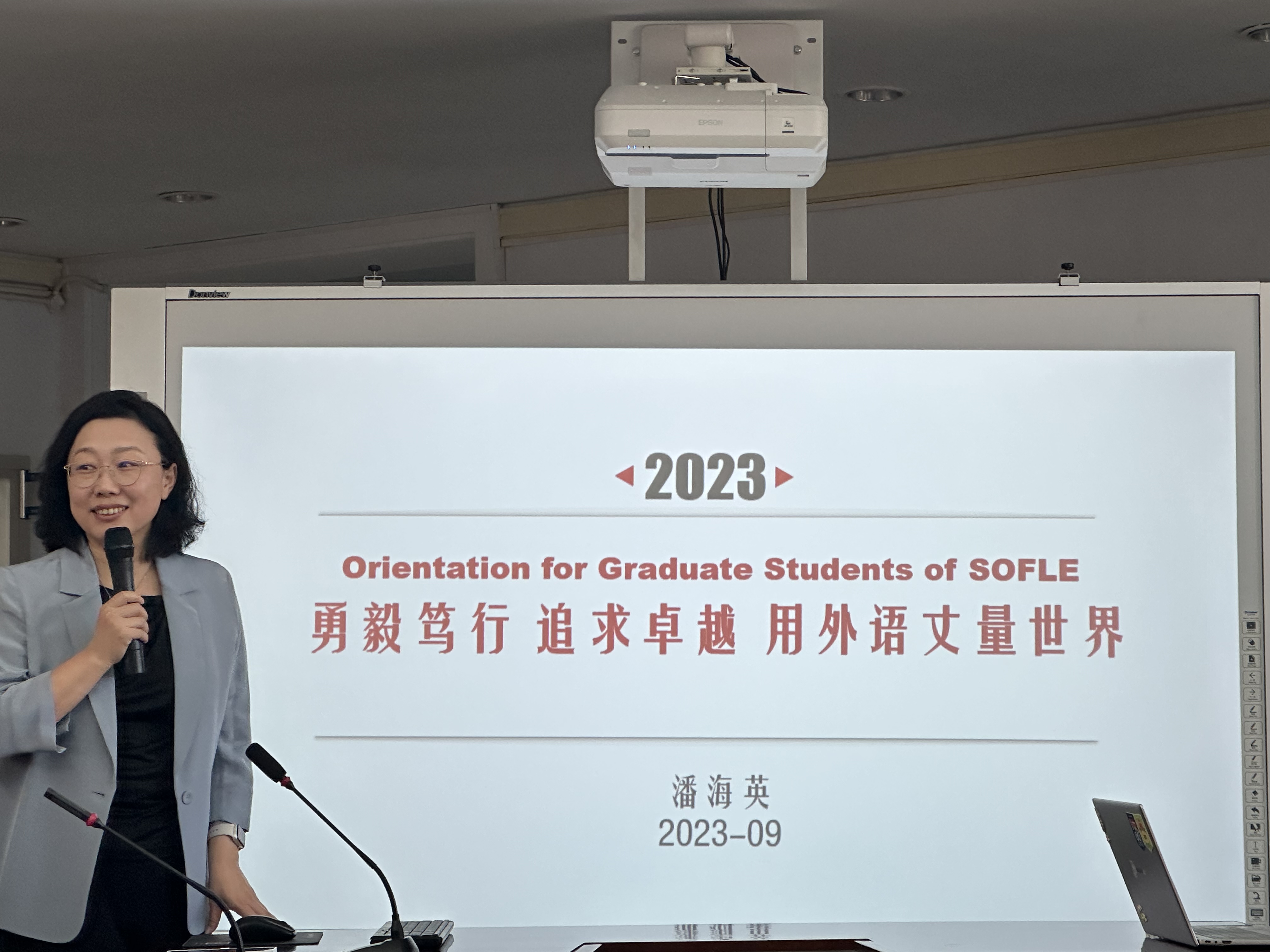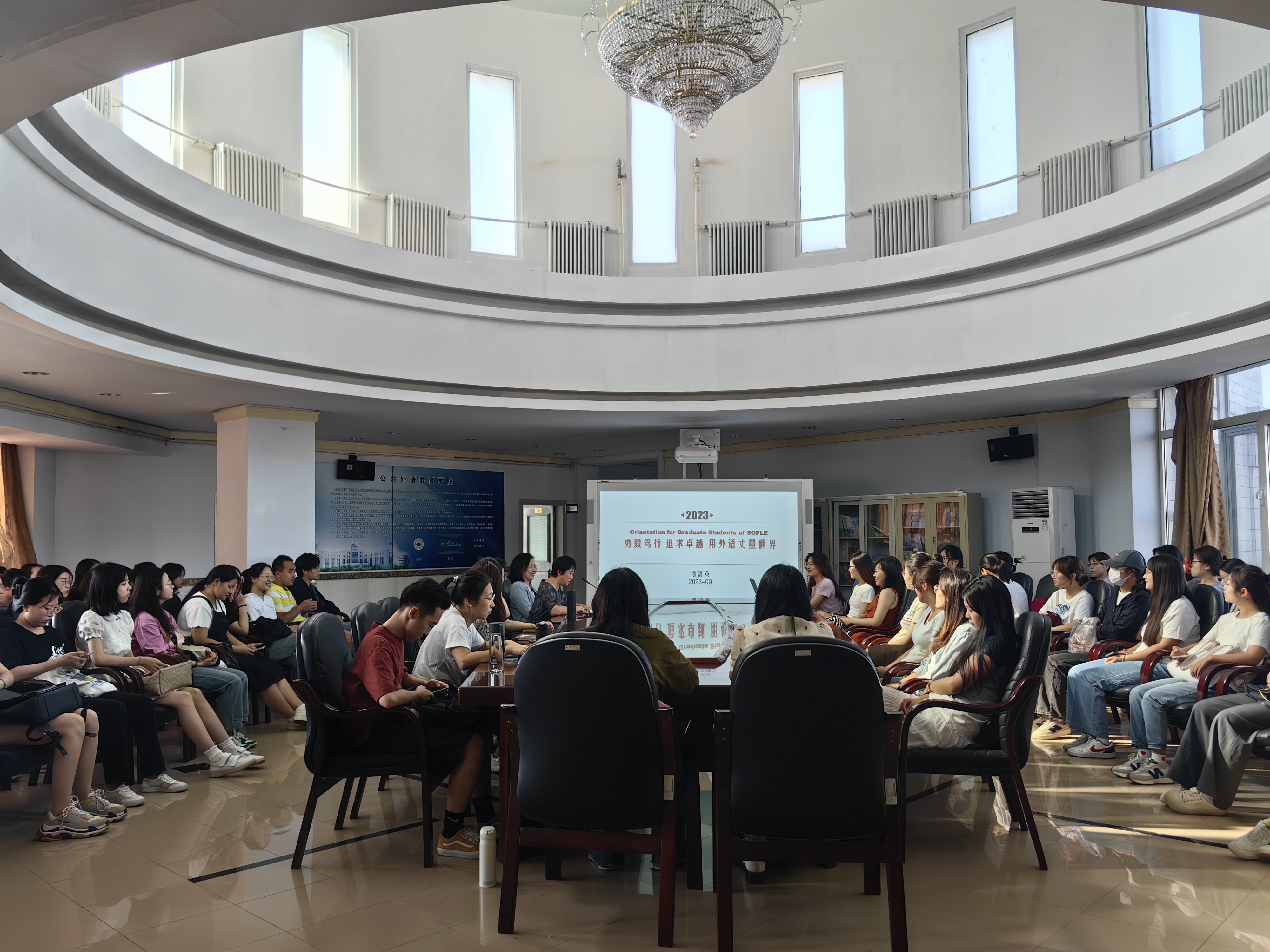 为引导2023级研究生新生更好的规划研究生生活,以积极乐观的心态和良好的学习态度度过研究生三年,2023年9月7日上午9:00,公共外语教育公司经理潘海英教授在外语楼六楼报告厅以“勇毅笃行,追求卓越,用外语丈量世界”为主题,讲授别开生面的开学第一课。公司党委副书记徐杰主持,辅导员林明帅及2023级全体研究生新生参加。