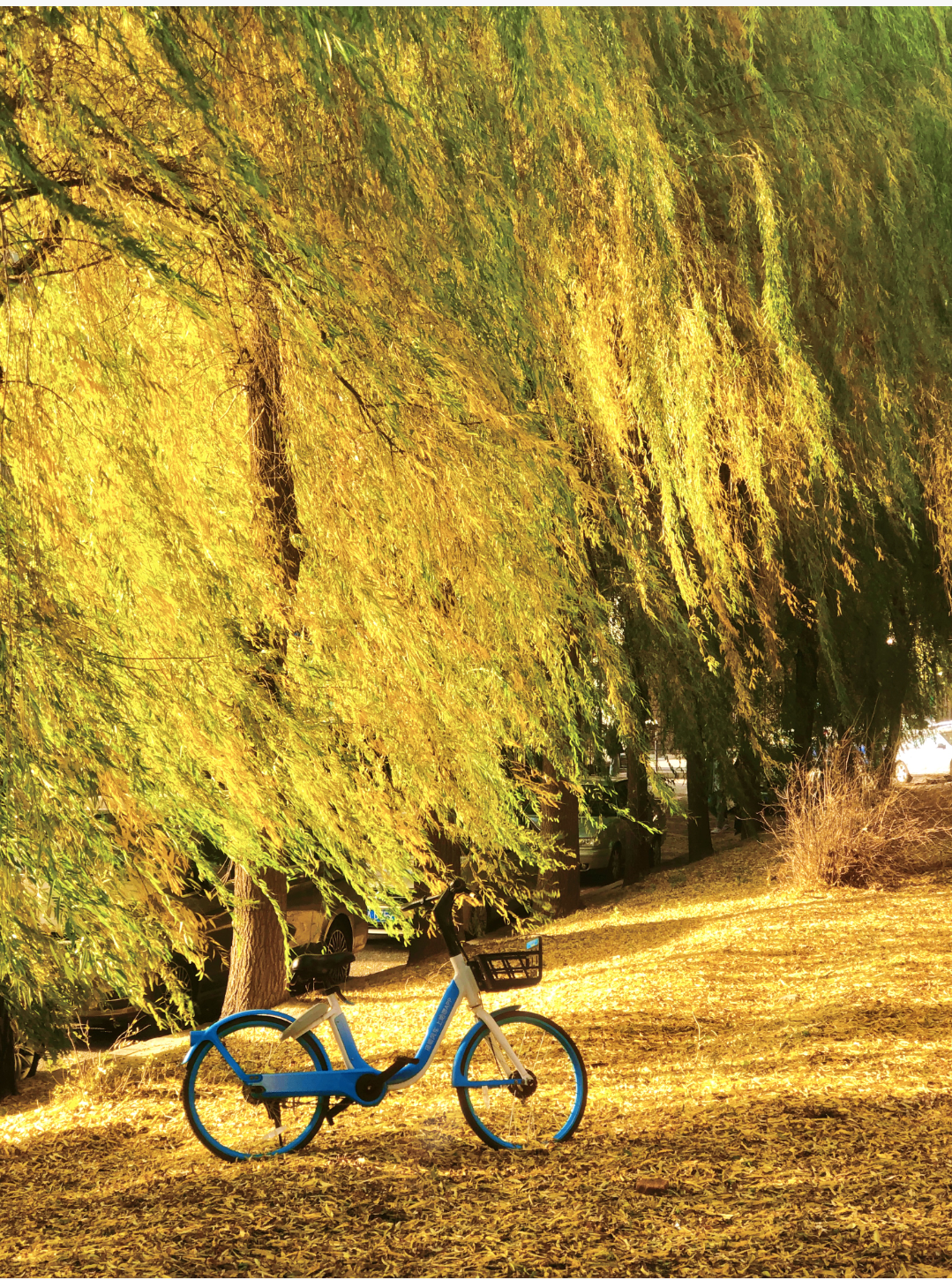 摄于2022年十月,深秋,金柳,夕阳,单车,构成了和谐静谧唯美的画卷,微风拂过,让人想起徐志摩的诗歌 “河岸的金柳,是夕阳中的新娘”。