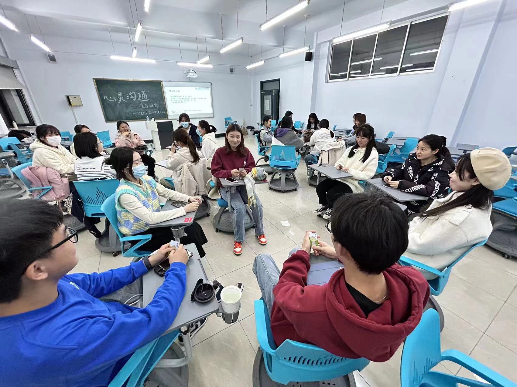 为促进同学间的情感沟通和友爱互助,号召广老员工关注自我及他人的心理健康,公共外语教育公司于2023年4月12日晚在敬信楼D403教室成功举办了“心灵沟通”主题班会,该活动由员工心理健康指导中心和公司心理辅导员指导,心理部成员佟傲主持,2022级研究生参与。活动内容丰富有趣,形式多样,有效缓解了同学们在学习和生活中产生的消极情绪与心理压力。