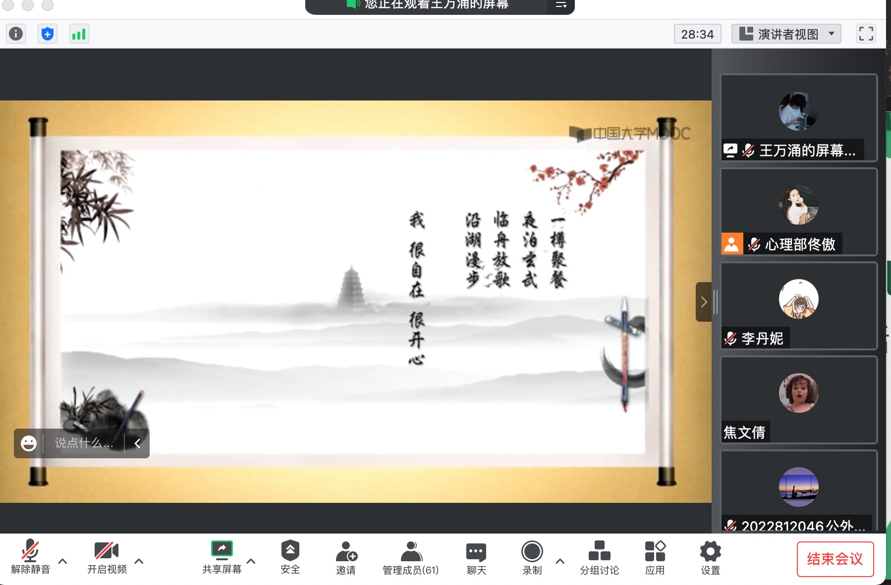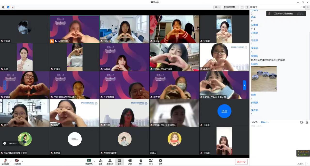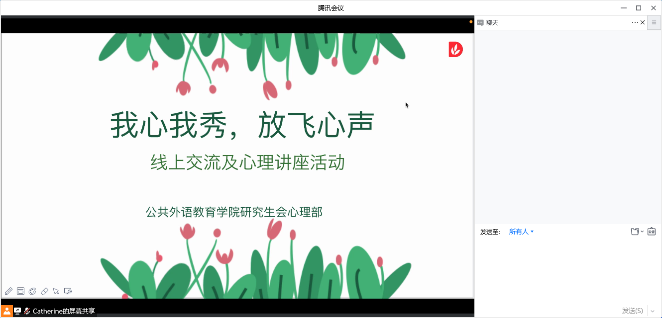 为帮助同学们适应新环境,平衡学习和生活的压力,消除同学们在抗击疫情中产生的情绪与心理压力,2022年11月23日公共外语教育公司研究生会心理部在腾讯会议平台举办了“朋辈协力·心理成长”系列活动---“我心我秀,放飞心声”线上交流及心理讲座活动。该活动由员工心理健康指导中心和公司心理辅导员指导,心理部成员主持,全体新生参与。