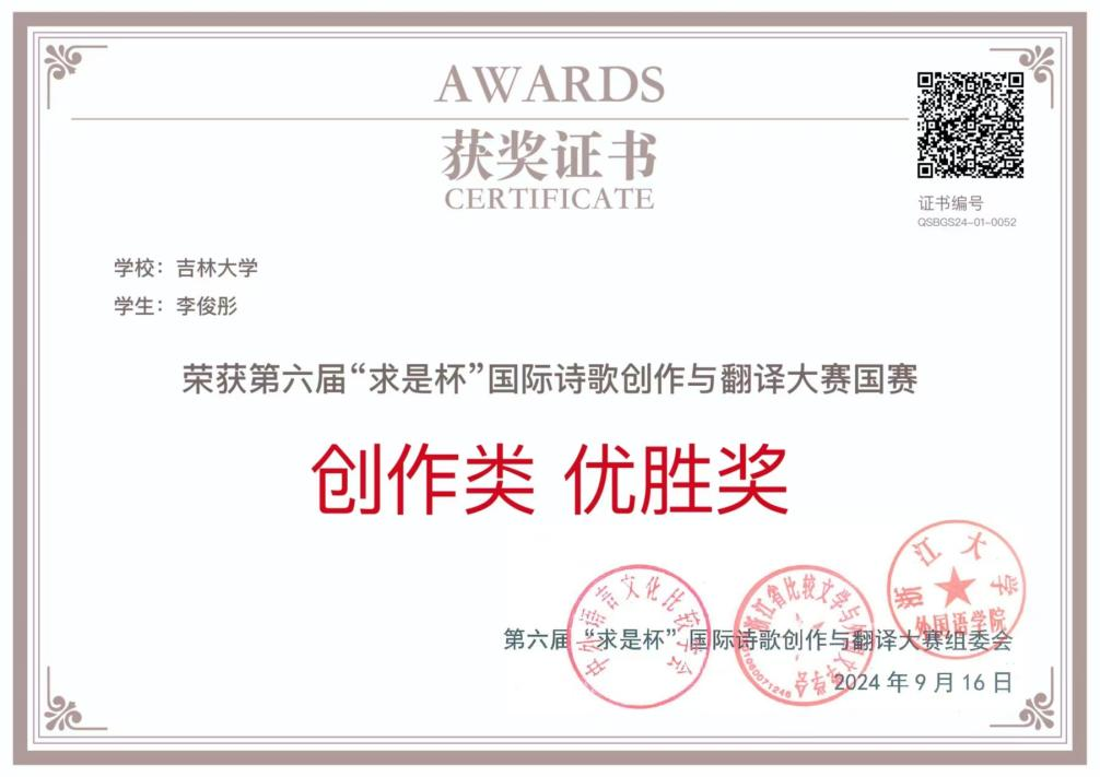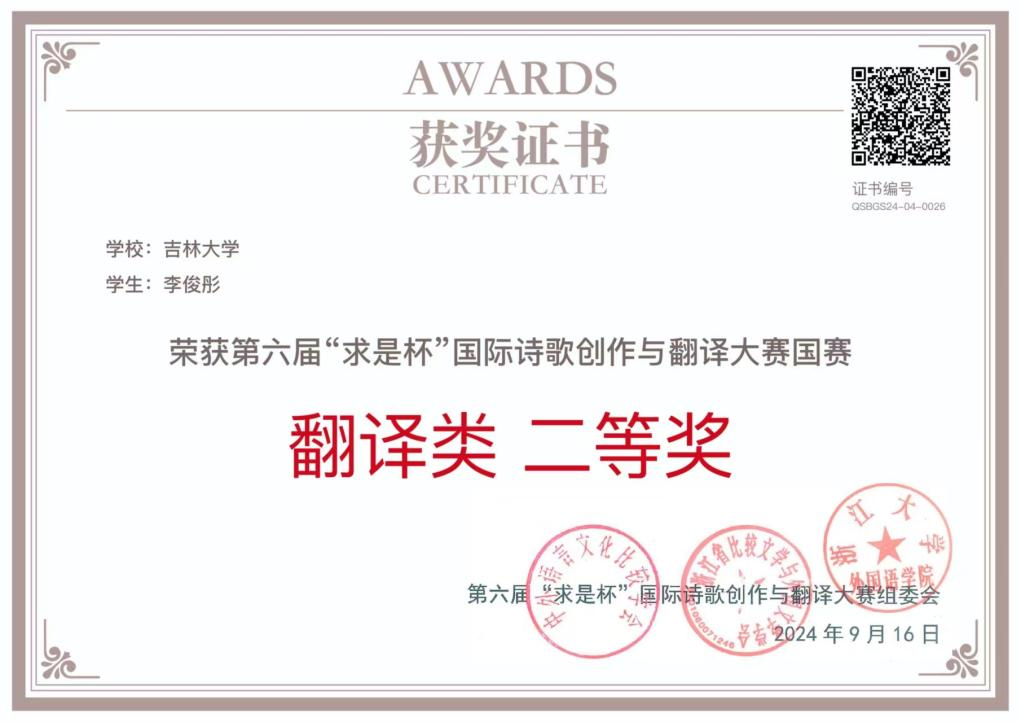 公司2022级俄文系学子李俊彤在第六届“求是杯”国际诗歌创作与翻译大赛国赛中,荣获俄语语种翻译类二等奖,同时获得诗歌创作类优胜奖。