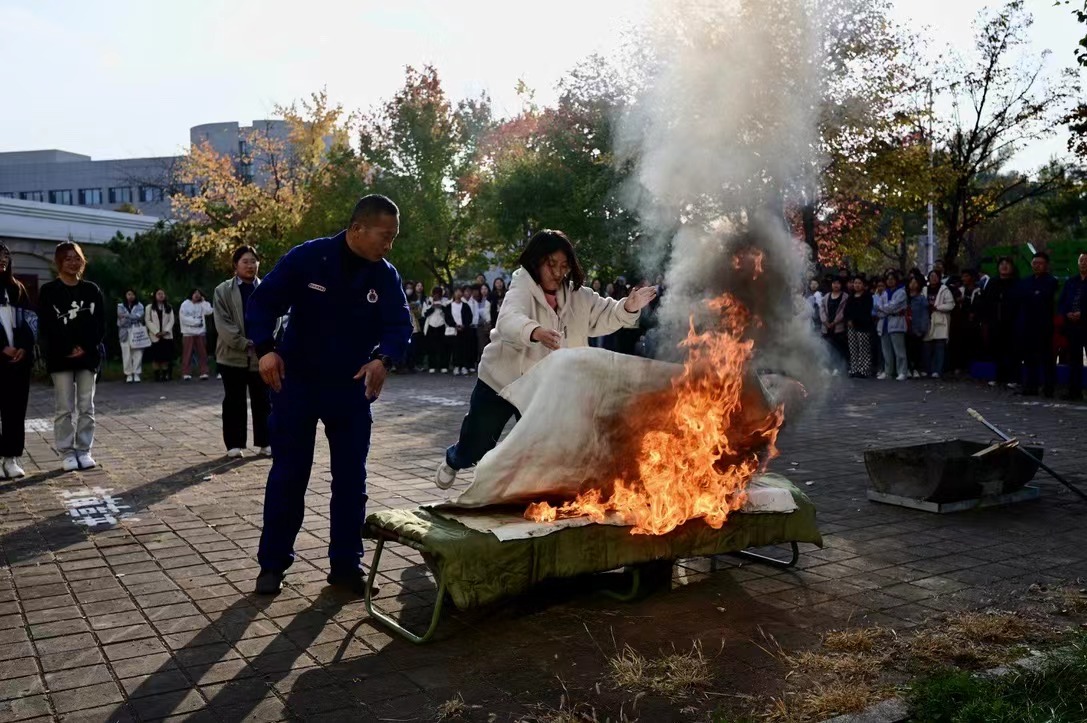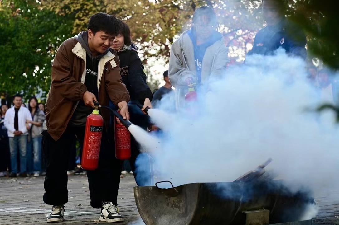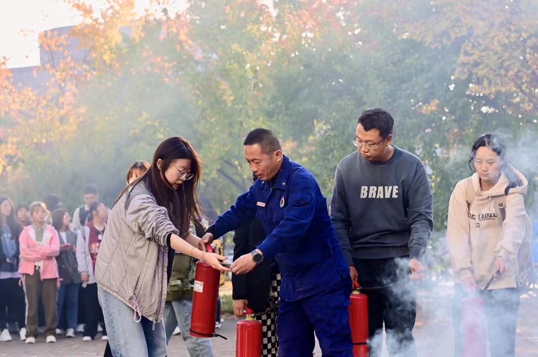 首先,董老师以实际发生的数场火灾为例,结合外院实际学习、工作环境,详细介绍了安全防火的知识及消防演练的流程。消防演练开始后,专业人员在外语楼内模拟了火灾现场的烟雾与警报,楼内全体师生员工和讲座现场的员工有序撤离至外语楼西门小广场。集合后,师生们现场学习了多种火源的灭火方法并进行了实践,亲身体验了如何在真实火灾场景中保障自身安全。
