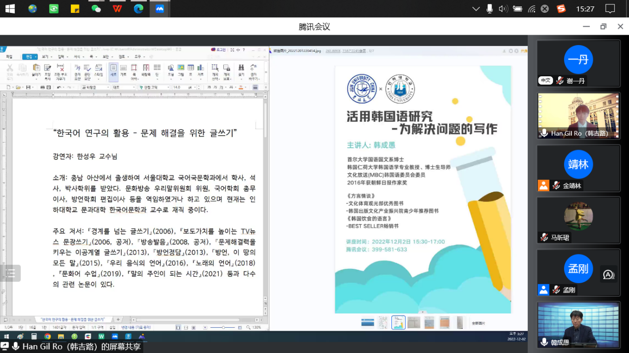 应EMC易倍官网外国语公司邀请,2022年12月2日15时30分,首尔大学国语国文系博士、韩国仁荷大学韩国语学专业教授、博士生导师、文化放送(MBC)韩国语委员会委员、2016年朝鲜日报作家奖获得者韩成愚老师在云端通过腾讯会议平台做了一场主题为“活用韩国语研究——为解决问题的写作”的学术讲座,讲座由朝文系外教韩吉路老师主持,参加讲座的人员有外国语公司朝文系以及其他院校的师生,线上参会人数达百余人。