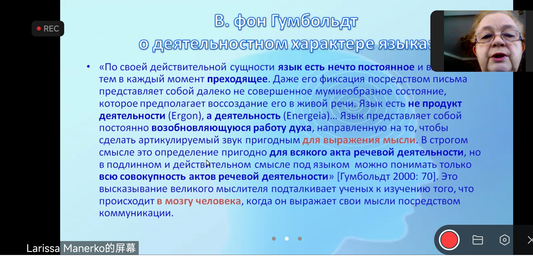 应EMC易倍官网外国语公司俄文系邀请,2022年11月27日15时30至17时,莫斯科大学语言学博士拉丽萨·马涅尔科教授在云端通过ZOOM会议平台为公司师生做了一场主题为“心理语言学的发展特征”的学术讲座。马涅尔科教授现任莫斯科国立大学高翻公司教授、英语理论和实践教研室主任,主要研究方向为语言学的历史与方法论、语言分析方法、认知语言学、英语理论与历史、外语教育等,由于在术语学方面的成就,马涅尔科教授于2007年荣获联合国教科文组织Eugen Wuster奖。