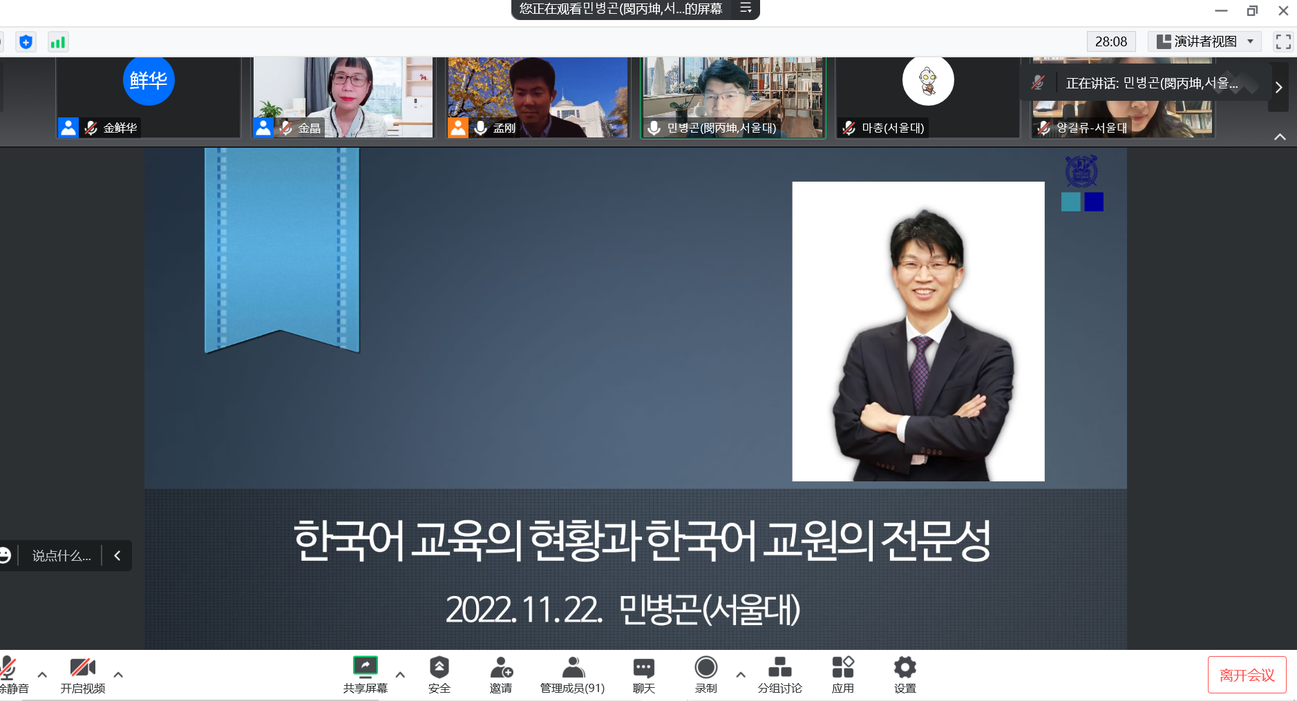 应EMC易倍官网外国语公司朝文系邀请,2022年11月22日19时,韩国语教育学会会长、韩国教育课程评价院研究咨询委员会委员长、首尔大学国语教育系闵丙坤教授通过腾讯会议进行了一场主题为“韩国语教育的现状与韩国语教师的专业性”的学术讲座。本次讲座由外国语公司副经理金晶主持,外国语公司朝文系、韩国首尔大学及国内外其他院校师生参加了此次讲座,线上参会人数共计120多人。
