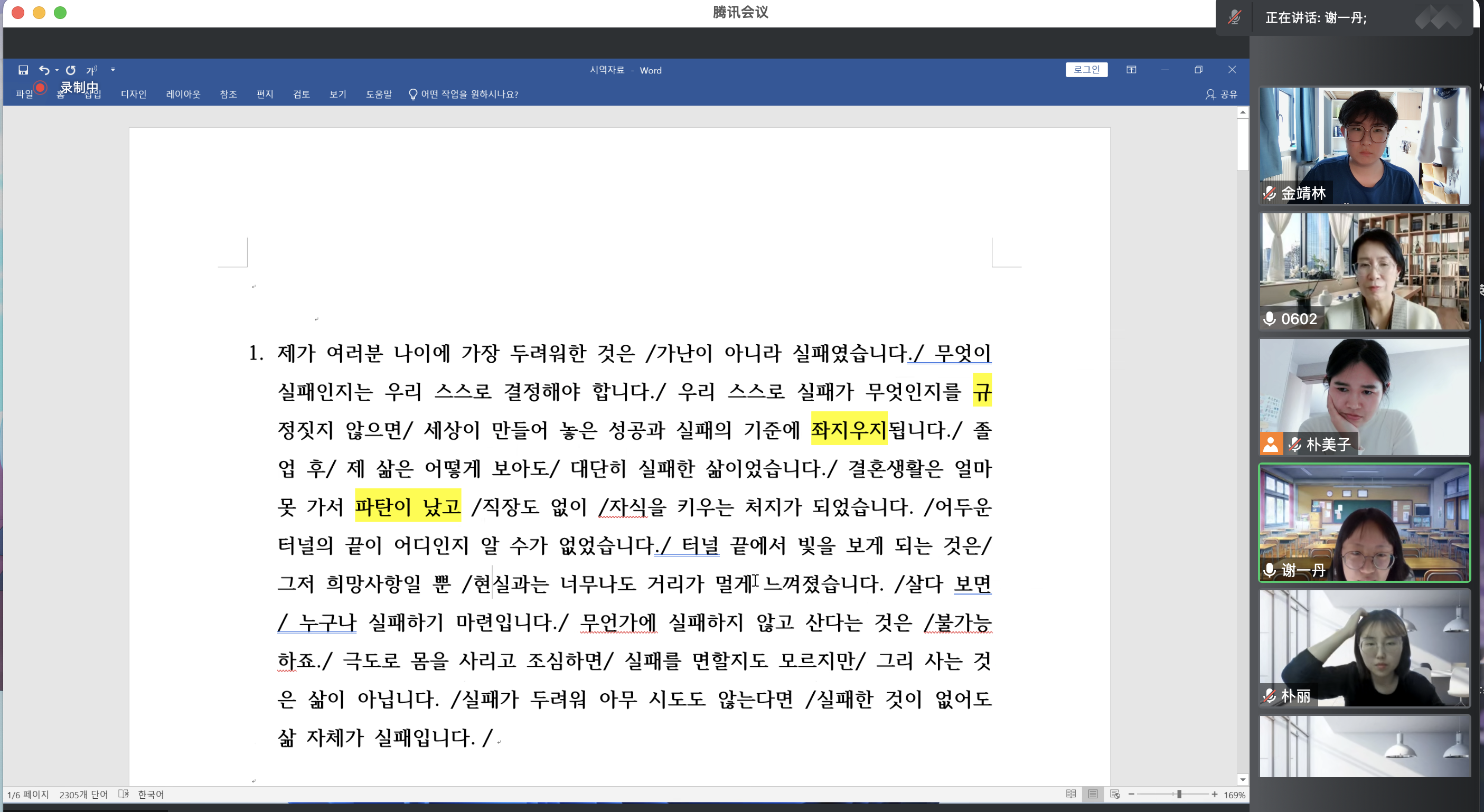 最开始,金珍我教授向我们讲解了如何进行视译。金珍我教授向我们讲述了中韩语言进行视译的差别,讲授了进行中文视译和韩文视译的技巧。金珍我教授用现场连麦的方式,找了几位同学进行了视译练习,并同过练习给大家讲解了过程中所遇到的问题及如何应对。