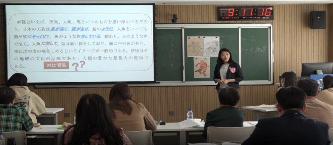 决赛中,潘宁老师在讲解日本妖怪文化的过程中不仅带领同学们学习了基本的语言知识,同时也提醒同学们在学习外国语言文化时,不要忘记关注本国文化,要用中国智慧解读世界不同民族国家文化,成为有家国情怀、有全球视野、有专业本领的新时代国际化外语人才。
