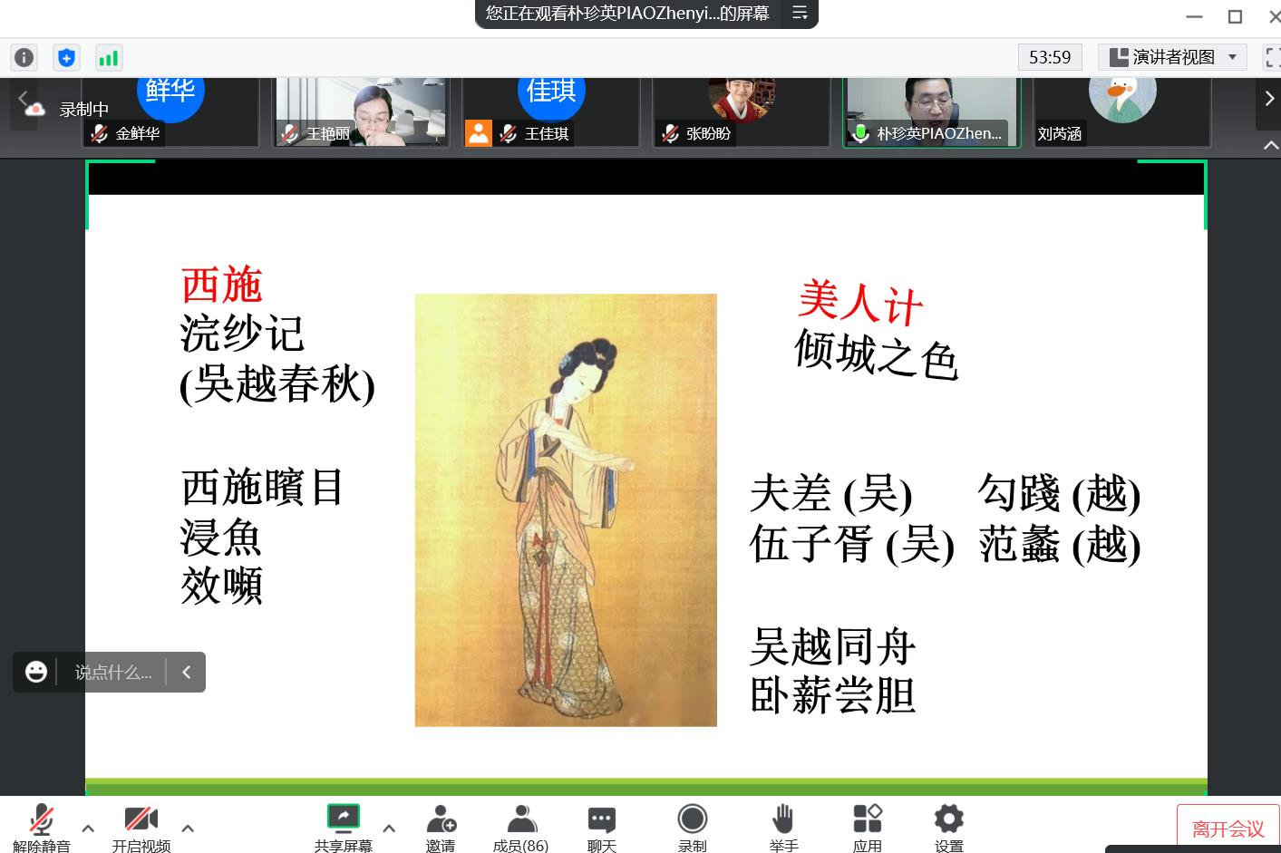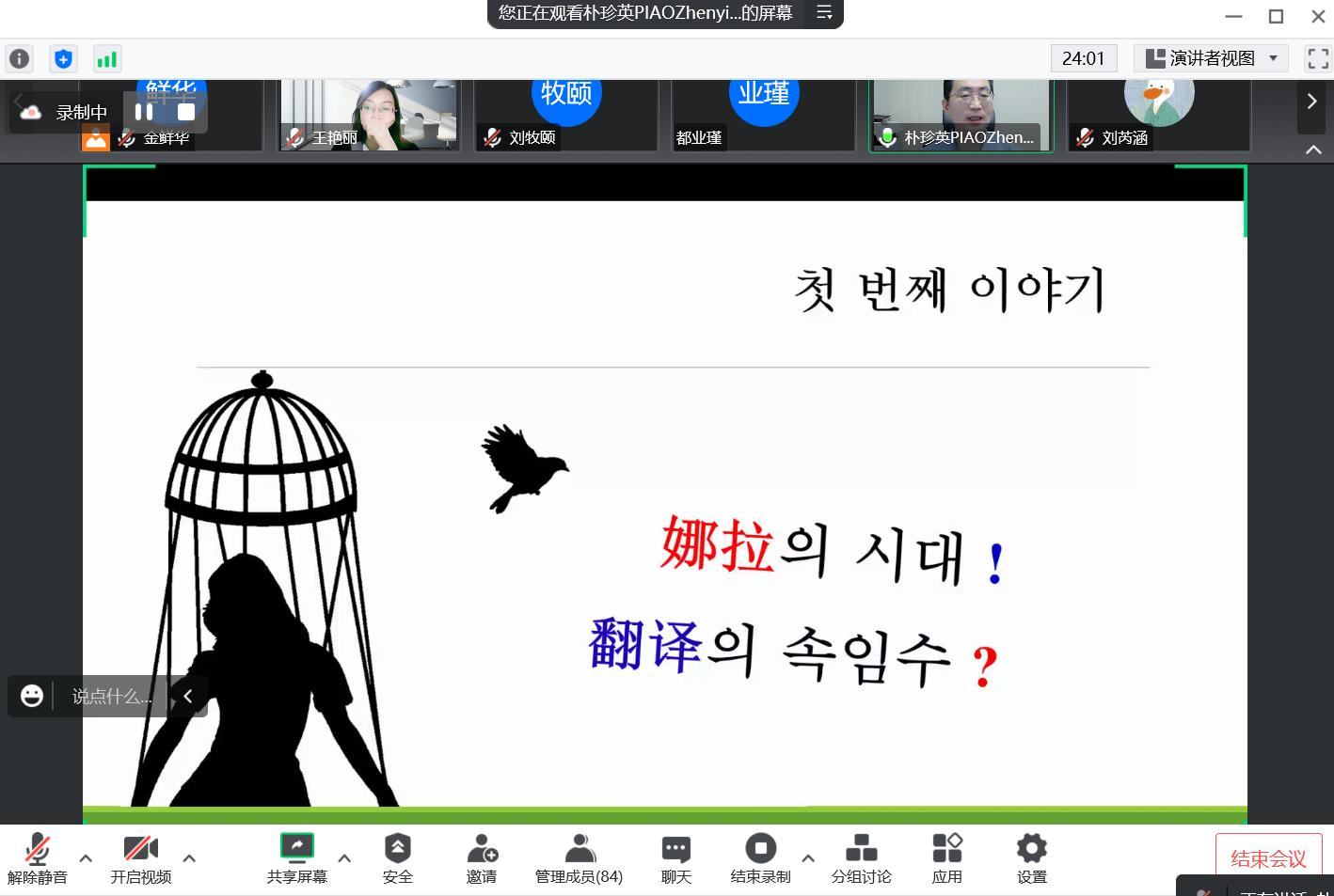 2022年11月10日,应EMC易倍官网外国语公司邀请,成均馆大学比较文化研究所长、成均馆大学国语国文学科朴珍英副教授在云端通过腾讯会议平台以“翻译与东亚女性”为主题进行了2个小时的学术讲座,讲座由朝文系教师王艳丽主持,参加讲座的人员有外国语公司朝文系以及其他院校的师生,线上参会人数达百人以上。