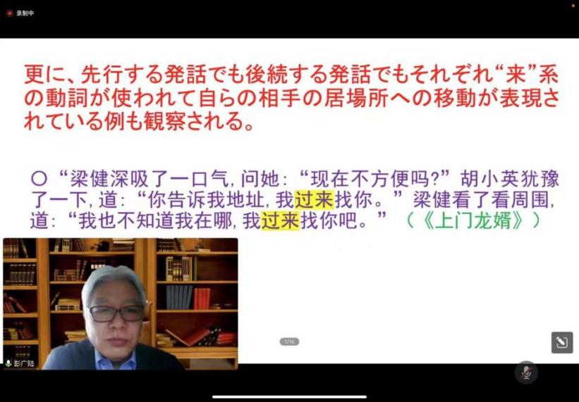 讲座中,彭广陆教授首先详细介绍了“位移”“位移动词”“视点”等核心概念,结合自己多年的研究经验总结了中日两国语言中位移动词的三种类型。之后,结合中日会话、小说中的具体实例,详细讲解了日语动词「来る」「行く」和汉语“来”“去”的多种用法。基于上述语言事实,彭广陆教授从“视点”的角度出发,分类解读了日语「来る」「行く」和汉语“来”“去”所构建的语言表达形式及其认知模式的差异,从类型学角度提出了日语「来る」「行く」的“视点固定型”特征和汉语“来”“去”的“视点移动型”特征,并就此观点进行了深入解析。最后,彭广陆教授还分享了自己二十多年来关于视点研究的论文和研究成果,为在座的师生们指明了以后视点研究的趋势和方向。