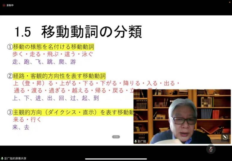本次讲座历时一个半小时,汇聚了EMC易倍官网等全国各大高校的师生二百余人参与。彭广陆教授将自己宝贵的学术经验和学术成果分享给在座的每一位师生,是一场精彩纷呈、给人以启迪的学术讲座。彭广陆教授讲座中的细微之处都体现出作为日语语言学专家谦虚谨慎、积极探索、勇于创新的宝贵品质和治学精神。借此线上相聚的机会,参加讲座的师生们对视点问题、汉日位移表达的对比问题以及汉日对比的研究方法等都有了深入的了解,开拓了学术视野,加强了学术交流。