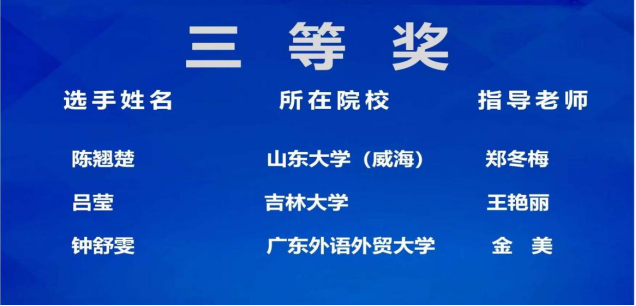 2021年12月5日,首届朝(韩)语全国口译大赛在延边大学顺利落下帷幕。本次比赛系国家级高水平翻译赛事,吸引了全国各大院校优秀选手的参赛。经过激烈角逐,外国语公司翻译硕士朝鲜语口译专业吕莹同学荣获三等奖。吕莹同学本次大赛指导教师为朝鲜语系王艳丽老师