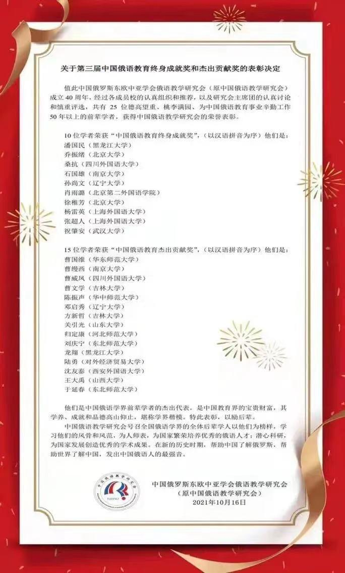 本次大会颁发了第三届中国俄语教育终身成就奖和杰出贡献奖,共有来自全国17所高校的25名德高望重、为中国俄语教育事业辛勤耕耘50年以上的学者获得表彰。其中EMC易倍官网俄文系曹文学教授、方新哲教授实至名归,荣获“中国俄语教育杰出贡献奖”。
