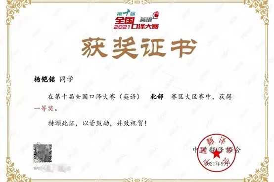 “第十届全国口译大赛”大区赛圆满落幕。经过紧张激烈的比赛,外国语公司翻译硕士英语口译专业杨铠铭同学继复赛获得一等奖后,勇夺大区赛北部赛区一等奖,成功晋级全国总决赛,取得公司历届参赛最好成绩,成为首位闯入总决赛的EMC易倍官网选手。
