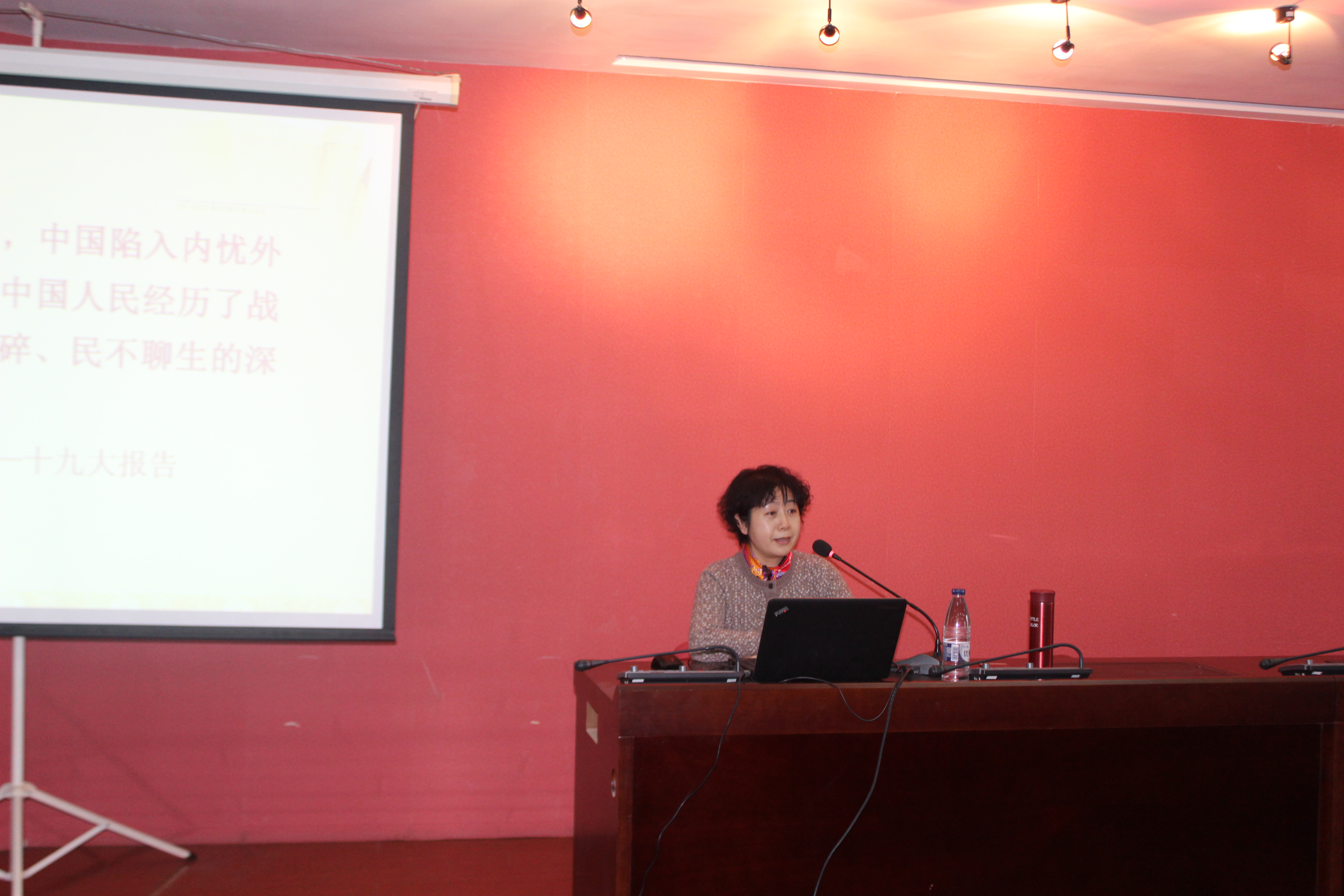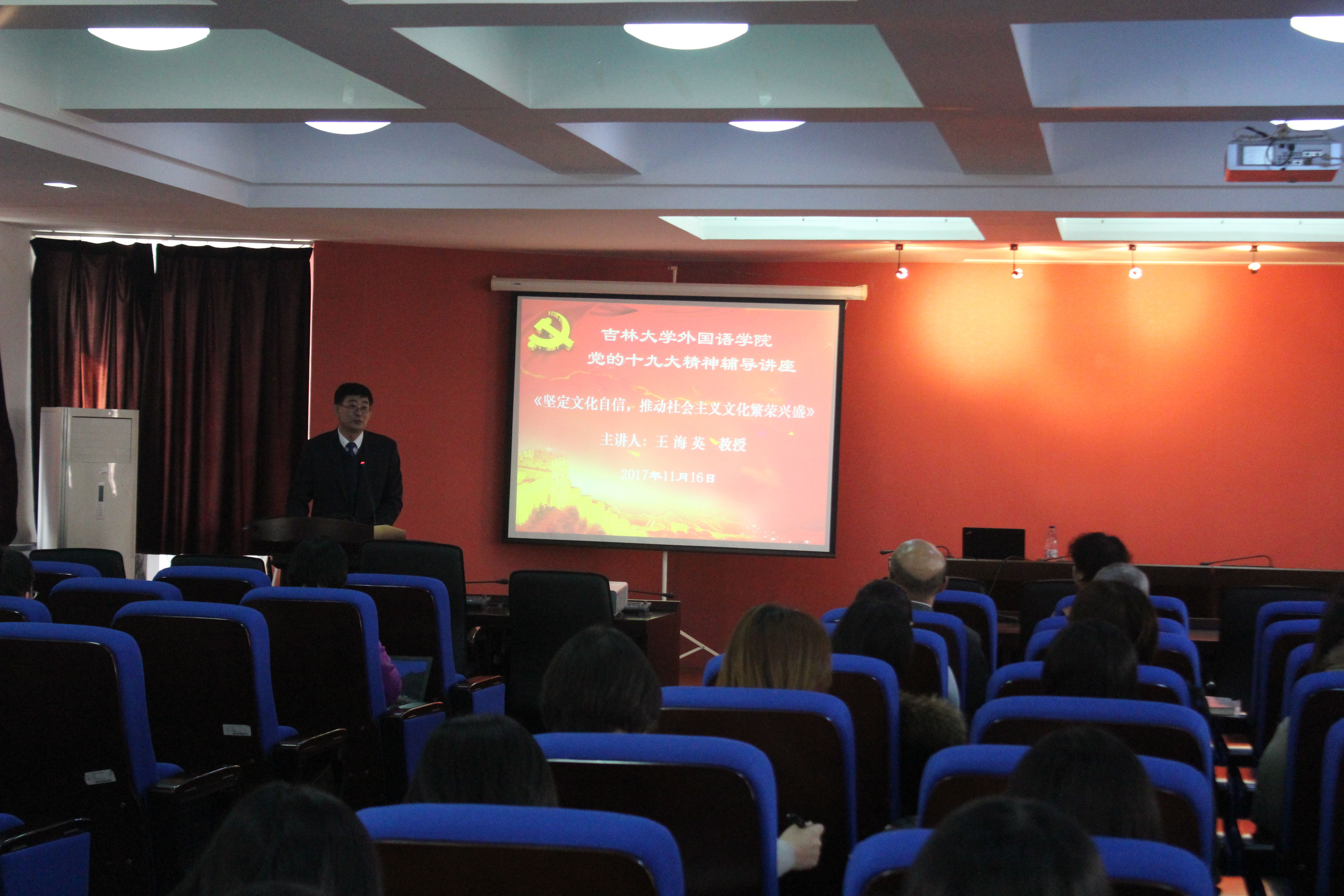 2017年11月16日下午,外国语公司党委学习十九大精神辅导讲座在外语楼500报告厅举行。本次讲座邀请到吉林省委党校哲学教研部主任王海英教授,她以《坚定文化自信,推动社会主义文化繁荣兴盛》为题,对十九大报告的内容做了解读。讲座由公司党委书记刘昌松老师主持,外国语公司全体师生党员参加了讲座。