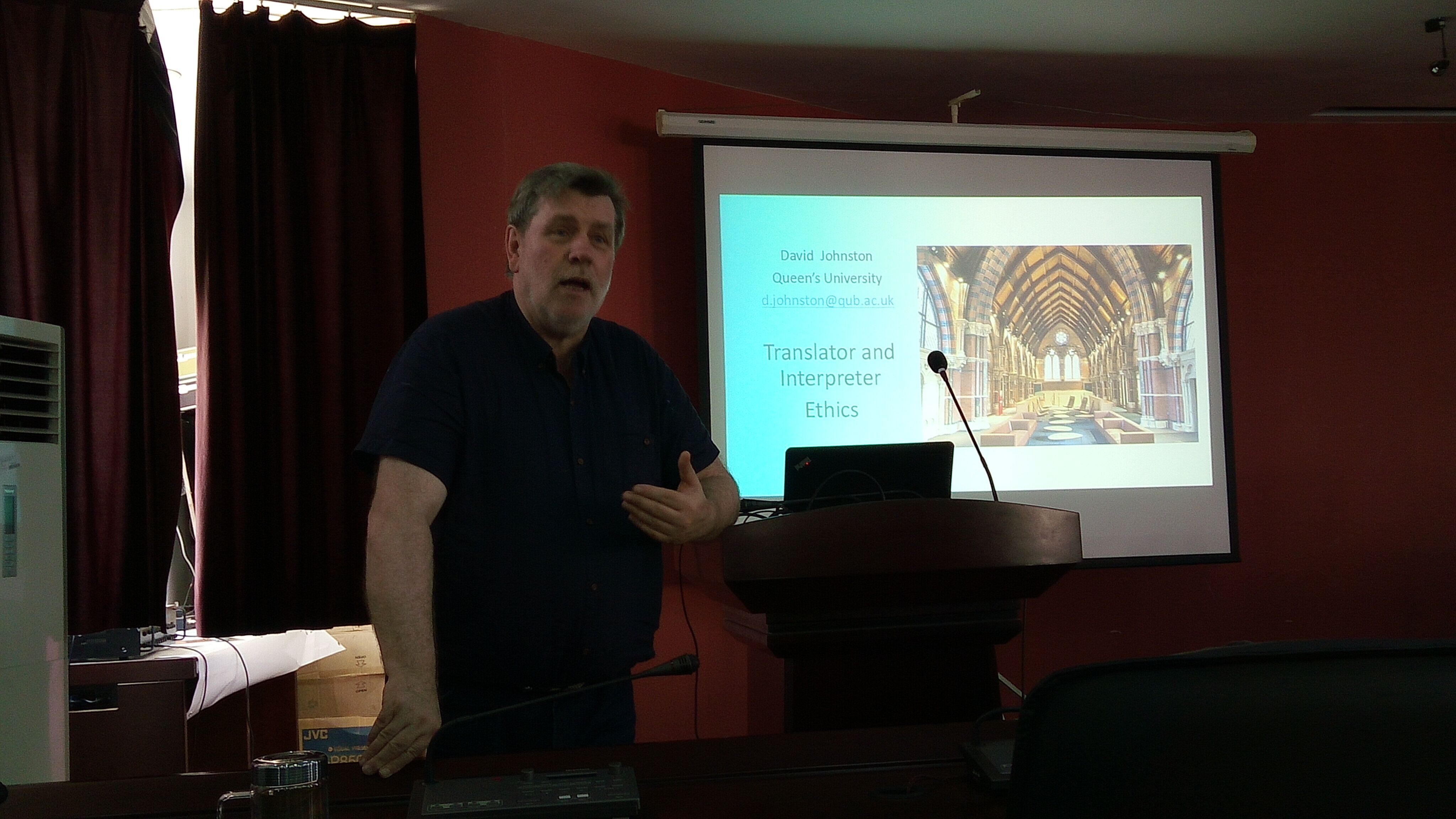 应外国语公司邀请,英国贝尔法斯特女王大学(QUB)艺术英语语言公司翻译中心主任、博士生导师David Johnston教授于5月10-13日来访公司,与外国语公司师生展开学术交流。按计划Johnston教授将在外院举办系列讲座,并与公司就两校对应公司的进一步合作进行交流。