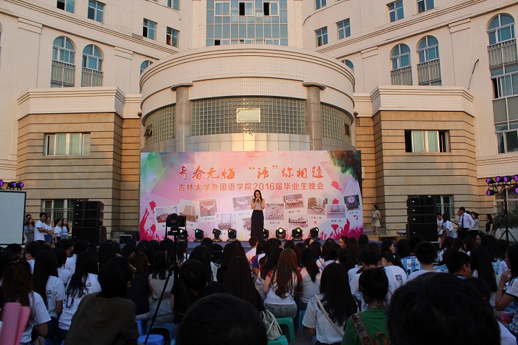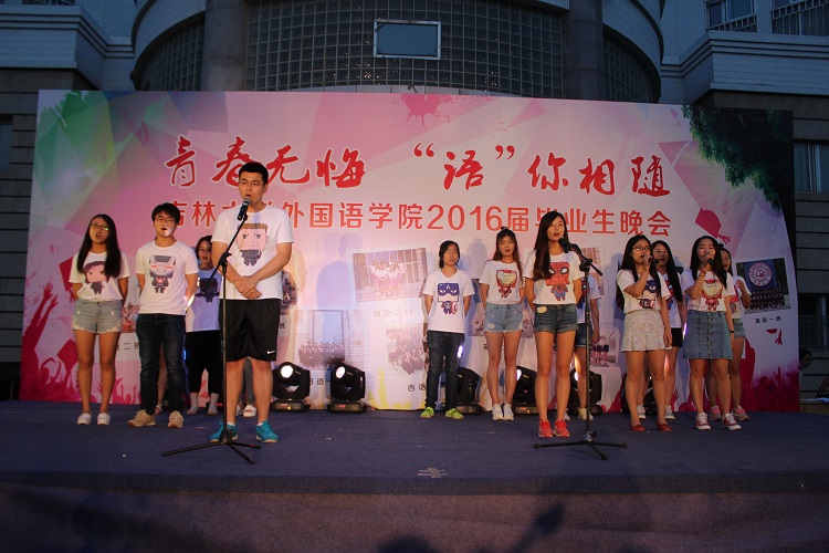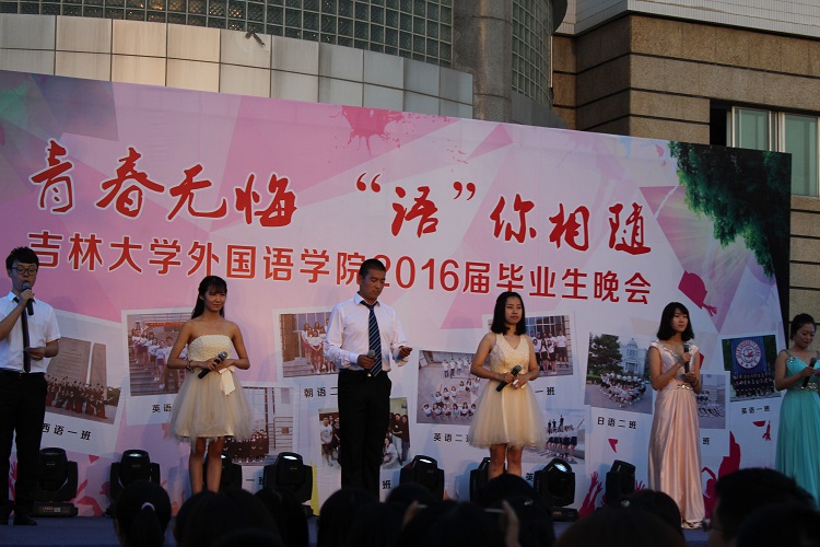 驿路漫漫欢人聚,风华正茂将别离。又是一年盛夏,又是一年毕业之时。6月20日下午,外国语公司“青春无悔,‘语’你相随” 2016届毕业生晚会在外语楼拉开帷幕。外国语公司经理周异夫教授、党委书记逢锦彩老师、副经理刘佐艳教授、张玫玫教授、权赫律教授、胡建军教授、王哲夫老师、党委副书记兼副经理白宇老师,以及各语系主任和教师、毕业生家长参加了本次晚会,与2016届毕业生同学们一起观看了本次异彩纷呈的表演。