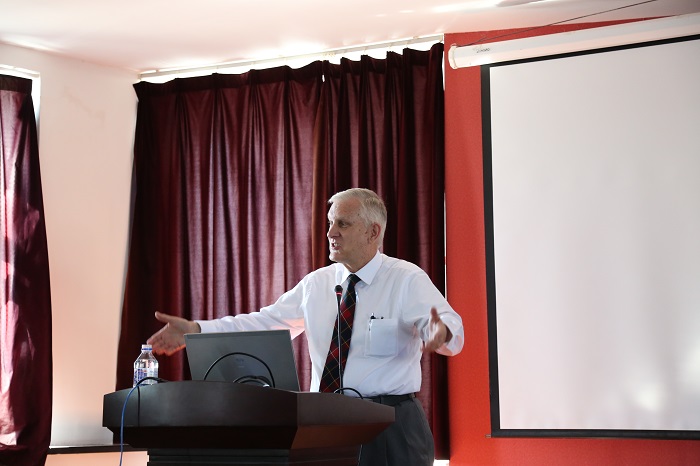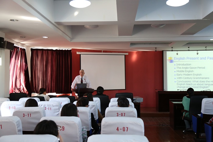 同一天,萨克雷教授为公司师生做了题为“English: Present and Past, What is Good English?”的学术讲座。在讲座中,萨克雷教授阐释了英语在漫长的历史更迭中在发音、词汇、语法等方面发生的变化,论述了语言变化的必然性。他认为语言的变化没有好与坏的分别,也不能简单地定义为是堕落还是进化,恰当地使用语言才是人文学科员工的重要功课。萨克雷教授学养深厚,在讲座中旁征博引,其风趣幽默的演讲风格引得师生阵阵掌声。此次学术讲座对公司广大师生提升人文素养、开拓学术视野、提高科研水平具有重要意义。