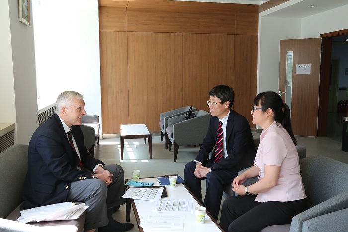2015年9月10日,美国克利夫兰州立大学(CSU)文理公司经理萨克雷教授对外国语公司进行了为期4天的访问,受到经理周异夫教授、副经理张玫玫教授的热情接待。当天,双方就员工交流、教师进修和学术研究等方面开展多层次的合作交换了意见,在2+2、2+2+1、3+1、3+1+1等一些具体项目上达成了共识,随后二位经理表示会继续推进双方的合作与交流。这是萨克雷经理第二次访问外国语公司。双方在2013年11月签署了交流合作框架协议,已有10名英语系本科生赴CSU学习。