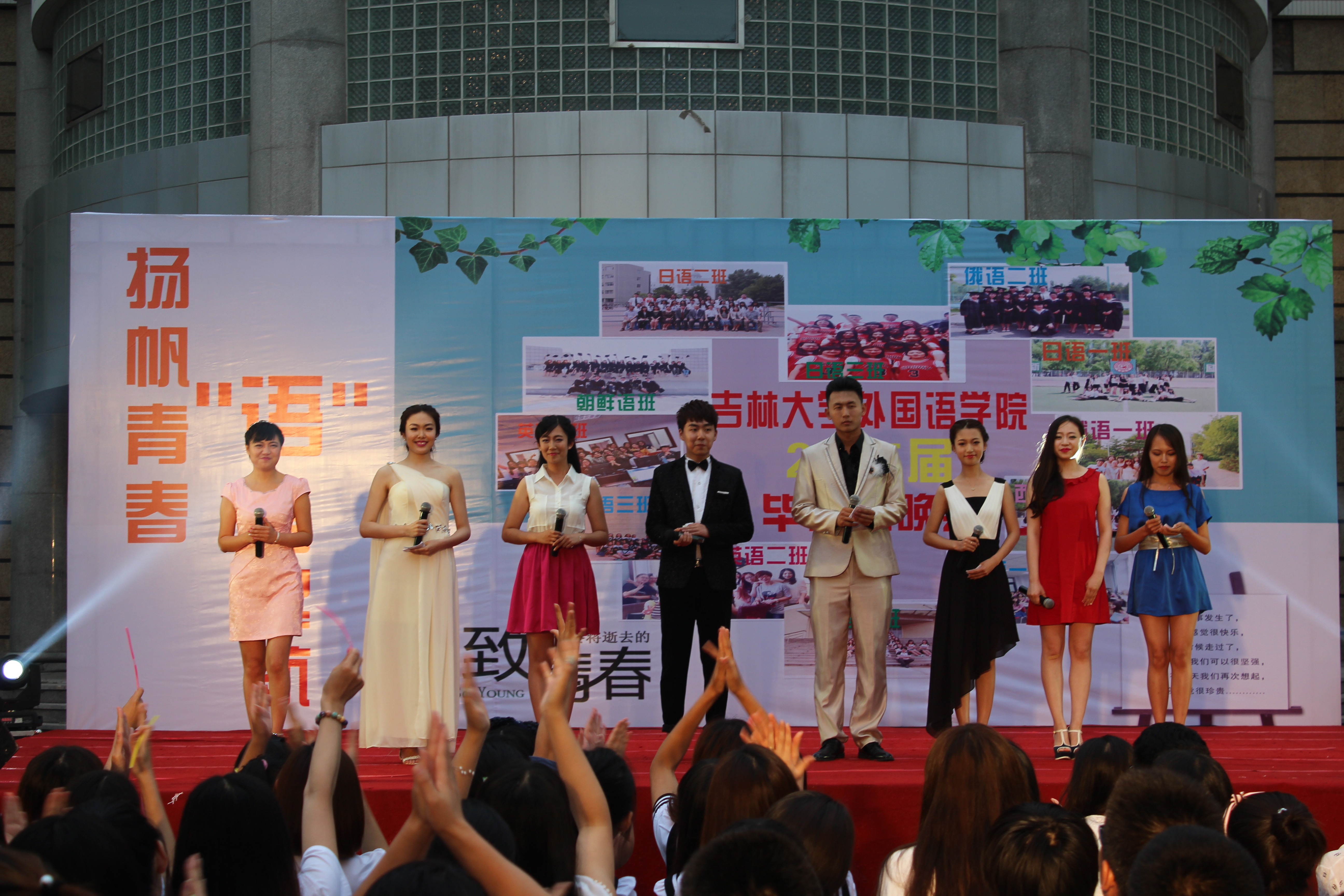 6月25日晚,外国语公司 “扬帆青春,语梦起航”2015届毕业生晚会在外语楼正门浓情上演。外国语公司经理周异夫教授,党委书记逄锦彩老师,副经理刘佐艳教授、张玫玫教授、权赫律教授、胡建军教授、王哲夫老师,党委副书记兼副经理白宇老师,以及各语系主任和教师、毕业生家长代表参加了本次晚会,与2015届毕业生同学们共同度过了一个愉快难忘的不眠之夜。