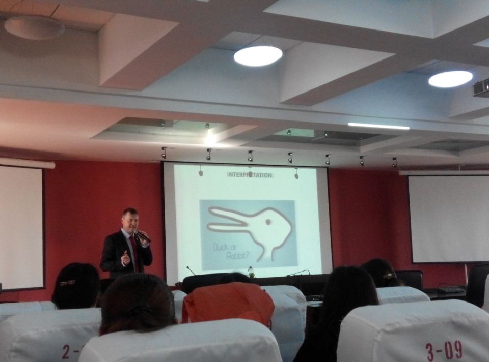 在本次短期课程中,Piotr Blumczynski博士主要从跨学科角度探讨翻译学,从翻译的本质、角色、意义、影响等出发,并结合语言学知识,加深和拓宽了研究生同学对翻译的理解及认识。在为期四天的集中课程里,Piotr Blumczynski博士首先探讨了翻译的本质,翻译与解释的关系,指出两者之间的区别往往很难分辨。他还通过隐喻的方式,将翻译与画画、做饭、传送、游戏、解题、移植、丛林探索等等各类活动进行对比,从各个侧面体现翻译的特点。随后,Piotr Blumczynski博士详细讲解了符号语言学的几项重要内容----index,icons,and symbolities----通过符号语言学知识提出对翻译的启示,即翻译的过程会不可避免地对原文产生作用,就此解释了为什么有些人认为翻译是一种不可避免的邪恶行为。Piotr Blumczynski博士又在接下来的讲座中探讨了翻译及语言学中的一些基本问题,如意思的含义是什么,意思的各个层面,及典型意思。另外,Piotr Blumczynski博士从认知语言学角度探讨翻译,讨论了照相理论,翻译中角度、方向等问题。最后,Piotr Blumczynski博士简要地介绍了自己的新研究,从哲学的各个领域探讨翻译的本质,翻译可能像人的思维一样无处不在,无法控制,通过将翻译与哲学中解释学的位置调换,更加深刻地探究翻译活动。Blumczynski幽默风趣,授课内容丰富,课堂上善于激发员工,开展师生互动,课下也与员工积极沟通交流,获得听课师生的一致好评。
