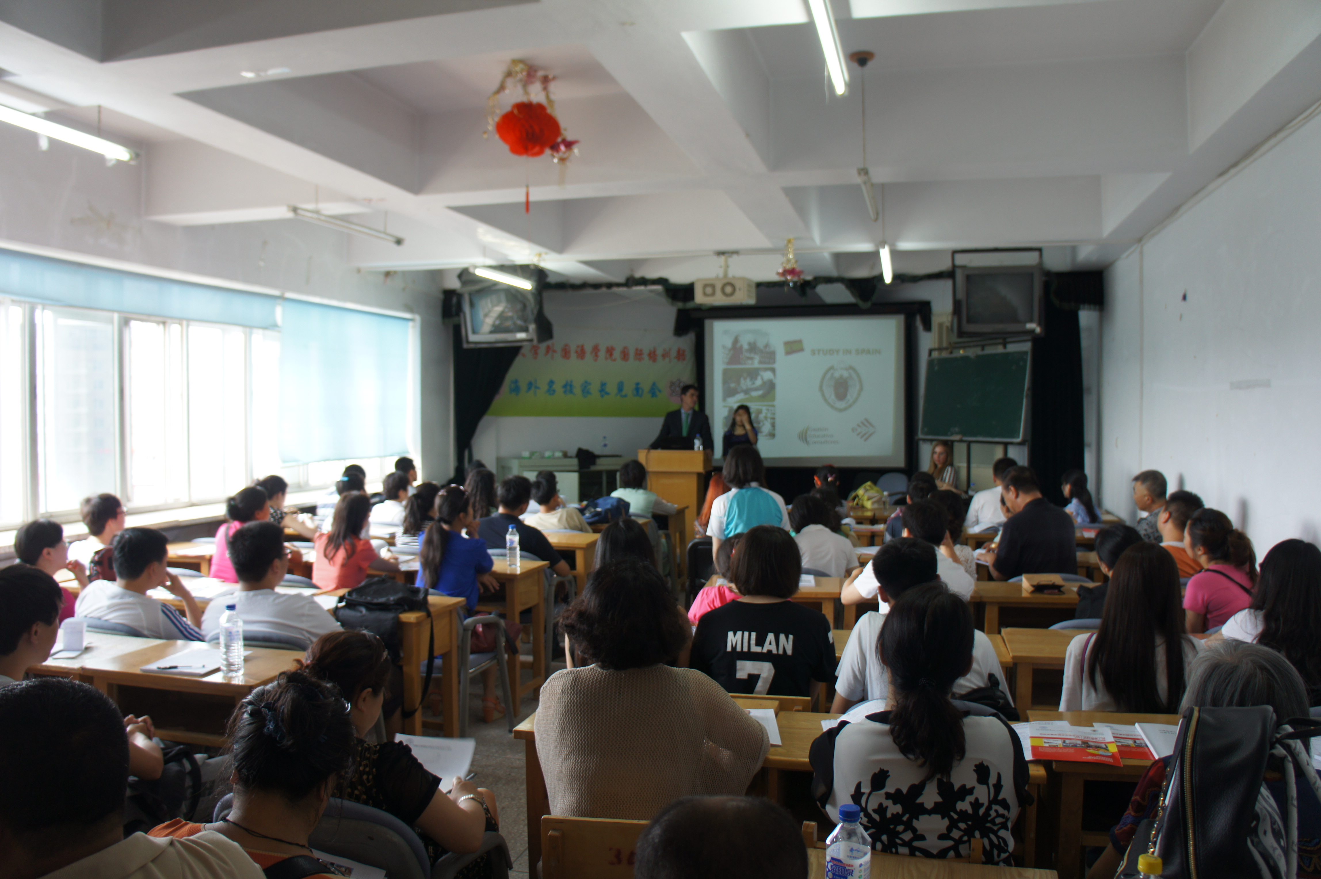 6月29日,外国语公司在外语楼508室举办了西班牙留学语言培训班宣讲会,60余名家长和员工参加了此次宣讲。会上,西班牙康普顿斯大学商贸旅游公司经理玛利亚·孔塞普西翁·加西亚·戈麦兹女士介绍了康普顿斯大学基本情况,西班牙高校入学申请中心主任胡安·卡洛斯先生介绍了项目情况,并与参会家长及员工进行了互动和沟通,会场气氛热烈。