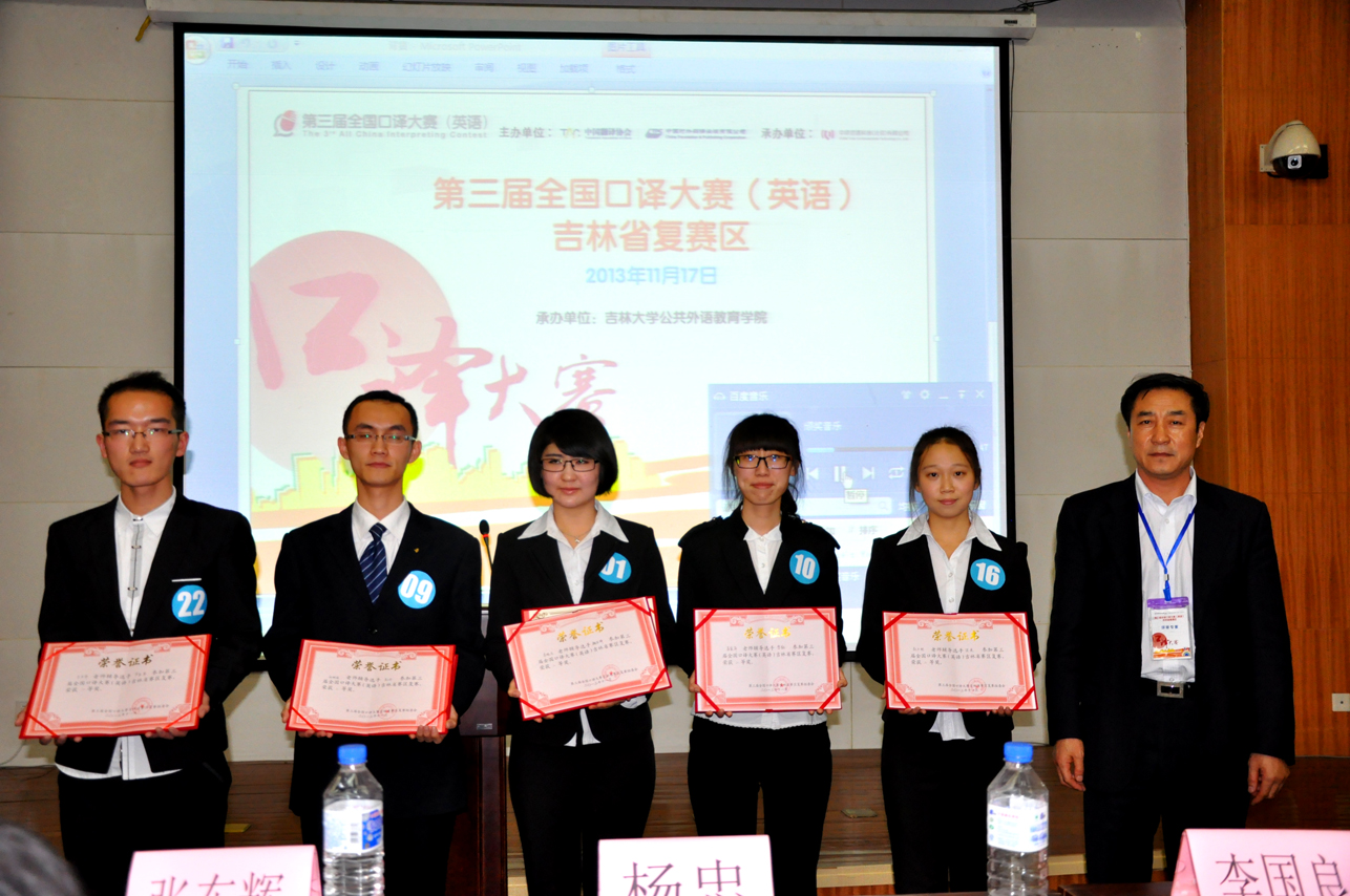 11月17日,外国语公司英语系口译专业2013级研究生赵丹同学,凭借其扎实的翻译功底以及沉着冷静的临场应变,在第三届“中译杯”口译大赛(英语)吉林省复赛中获得二等奖的优异成绩,并将于12月代表吉林省赴大连参加该赛事的东北地区赛。