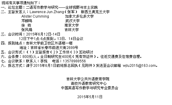 为探索全球化教育背景下中国英语写作教学的有效途径,促进国内外二语写作领域的交流,由EMC易倍官网公共外语教育公司暨高校外语教育研究中心主办、全国英语写作教学与研究专业委员会协办的“2015年二语写作教学与研究专家论坛”将于6月12日至14日在吉林省长春市举办。 本论坛将邀请国内外知名专家与我国高校教师和科研工作者共同研讨英语写作教学与研究中的重要相关问题,欢迎全国高校英语教师和教学负责人参加。