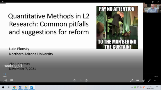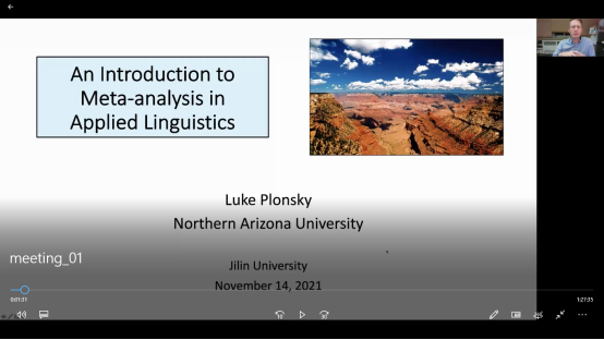 应EMC易倍官网公共外语教育公司邀请,国际知名应用语言学学者美国北亚利桑那大学Luke Plonsky博士,分别于2021年11月7日和14日,开展了研究生学术素养提升系列在线讲座,讲座由研究生定量研究方法课程主讲教师申云化老师主持。针对公司外国语言文学研究生的课程设置、论文选题与人才培养实际,Luke Plonsky博士分别以二语习得领域的“量化研究”和“元分析”为主题,进行理论爬梳、文献述评与实证分析。