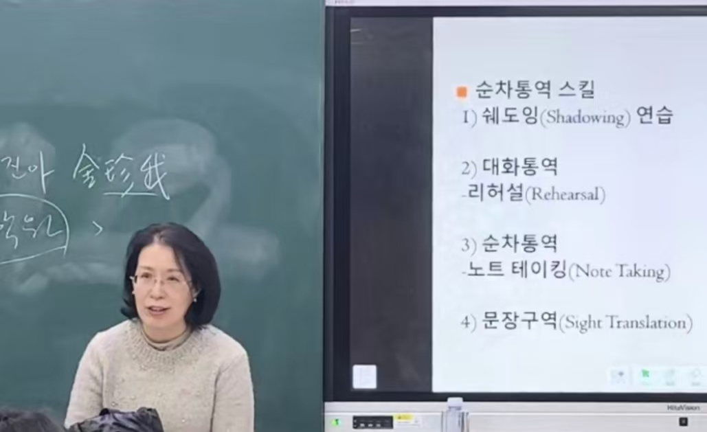 金珍我教授以交替传译的基础理论为切入点,系统介绍了交替传译的概念、工作原理和核心技能要求。她指出,交替传译的关键在于译员对信息的理解与精准传达,这要求译员具备高度的记忆力、语言表达能力和逻辑组织能力。在讲解过程中,金教授结合丰富的案例,向师生们展示了如何快速笔记、提炼要点以及构建语义链条。她强调:“交替传译不仅是一种语言技能,更是一种跨文化沟通的桥梁。”