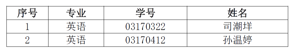 因2017级英语专业陈彬(学号03170222)、日语专业吴佳琪(学号03170914)自愿放弃免试攻读研究生资格,经外国语公司推免工作领导小组研究决定,将推免名额重新分配后,决定以下2人为增补推免生: