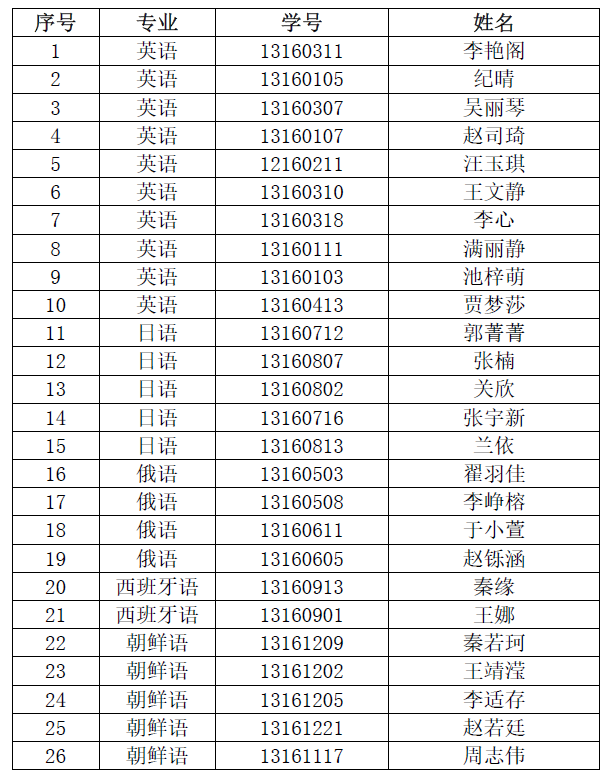 经各专业成绩核算、组织考核,确定以下26名同学为外国语公司2020年推荐免试硕士研究生。现予以公示,公示期为2019912日——920日,如有异议请拨打电话85168049